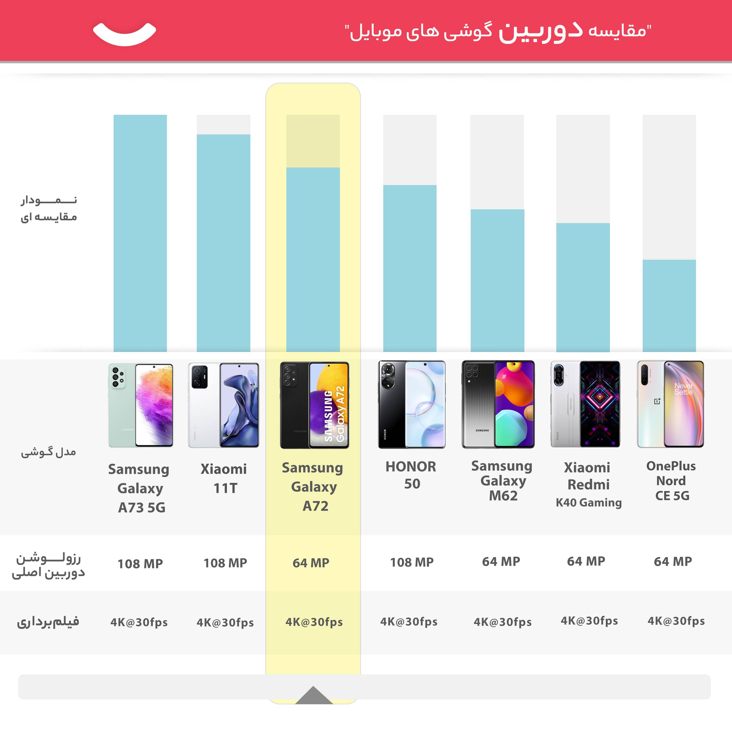دوربین Galaxy A72 برای خود تاریخچهای دارد؛ دوربین اصلی گلکسی A71 از نوع چهارگانه و با رزولوشن های 64، 8، 12 و 5 مگاپیکسل در نظر گرفته شده بود. با گذشت 1.5 الی 2 سال سامسونگ دوربین گلکسی A72 خود را با یک لنز فوقعریض با رزولوشن 12 مگاپیکسل و یک لنز ماکرو 5 مگاپیکسلی ارتقاء داده است. به این ترتیب دوربین Galaxy A72 شامل چهار دوربین روی قاب پشتی است. این دوربینها شامل یک لنز اصلی با رزولوشن 64 مگاپیکسل، یک لنز فوقعریض 12 مگاپیکسل، یک سنسور تلهفوتو 8 مگاپیکسلی و یک لنز ماکرو 5 مگاپیکسلی است. البته یک فلش دوربین هم تعبیه شده است که از نوع تک LED است. در نمای روبهرویی هم یک دوربین سلفی 32 مگاپیکسل قرار گرفته است. اپلیکیشن دوربین هم همانی است که در اکثر گوشیهای سامسونگ دیده میشود. اما با تغییرات خوب و مفیدی که با One UI 3.1 معرفی شد همراه است؛ مانند فونت بزرگتر برای حالتهای عکاسی مختلف و طرحی که با انتخاب این حالتها به آن اضافه شده است.