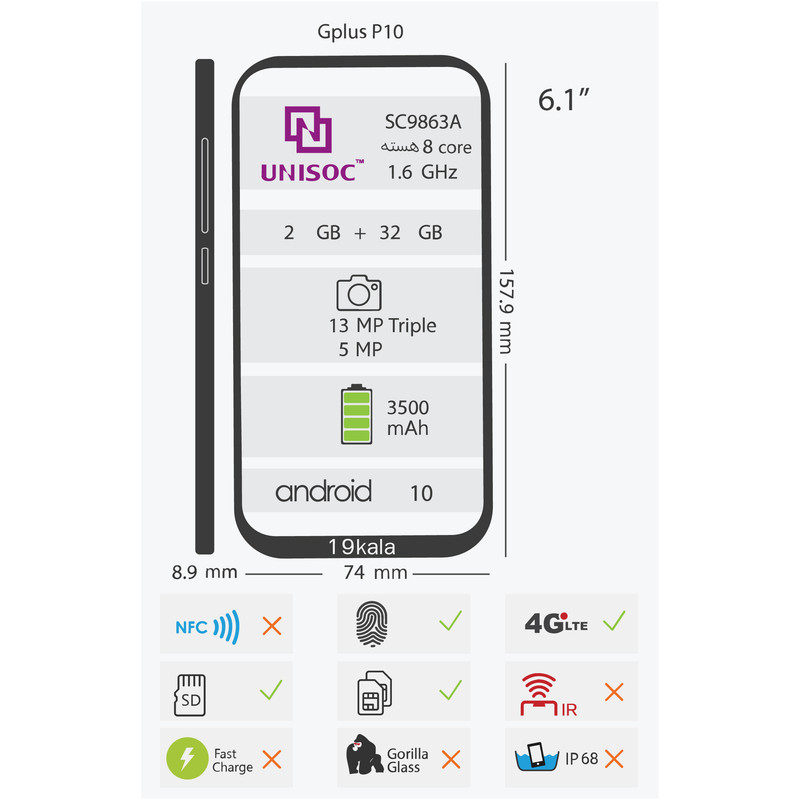این نسخه از گوشی موبایل جی پلاس P10 با رم 2 گیگابایتی و حافظه داخلی 32 گیگابایت روانه بازار شده است. این محصول دارای صفحهنمایش LCD است و ظاهر خوبی دارد. این محصول سامسونگ با نسخه 10 از سیستمعامل اندروید روانه بازار شده است تا از هر نظر گوشی مدرن بهحساب بیاید. صفحهنمایش استفادهشده در این گوشی 6.09 اینچ با رزولوشن HD است که با استفاده از فناوری LCD تصاویر خوبی را به نمایش میگذارد. این صفحهنمایش در هر اینچ نزدیک 282 پیکسل را نشان میدهد که این یعنی جزئیات و وضوح تصویر متوسط است. تراشه این محصول، UNISOC SC9863A Chipset است که به همراه 2 گیگابایت رم عرضه میشود. تراشهی گرافیکی PowerVR GE8322 GPU هم برای پخش ویدئو و بازیهای سبک مناسب است. این نسخه از گوشی با حافظه 32 گیگابایتی عرضه شده است و با استفاده از یک کارت حافظهی جانبی قادر خواهید بود حافظه داخلی را تا یک 128 گیگابایت دیگر هم افزایش دهید. دوربین اصلی X10 سنسور 13 مگاپیکسلی دارد و از نوع عریض (Wide) است. دوربین سلفی 5 مگاپیکسلی هم در قاب جلویی این گوشی به کار گرفته شده است. باتری 3500 میلیآمپرساعتی و حسگر اثرانگشت در پشت گوشی هم از دیگر ویژگیهای این تازه وارد است.