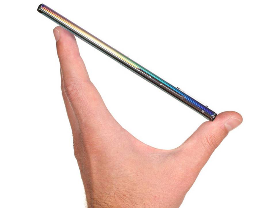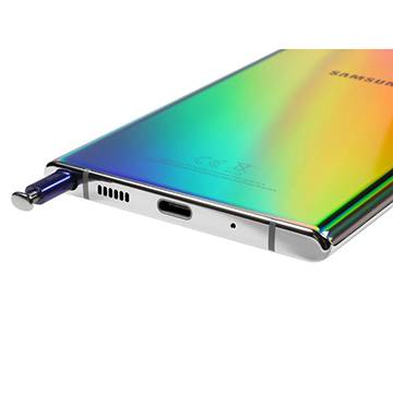 اگر به دنبال خرید این گوشی هوشمند هستید، احتمالاً اگر قبلاً هم گوشی بزرگی داشتهاید و اندازه آن برایتان آزاردهنده نخواهد بود. اولین راهحل موفق برای ساده کردن فرمول زیبایی و کارایی بیشتر، تغییر مکان حسگر اثرانگشت در گلکسی نوت 10 پلاس است. با توجه به امنیت بالای این راه برای باز کردن گوشی، حذف آن چندان منطقی به نظر نمیرسد. در این گوشی خبری از حسگر اثرانگشت روی قاب جلویی نیست و در عوض این حسگر زیر صفحهنمایش قرار گرفته است تا Galaxy Note 10 Plus از همه نظر به گوشی مدرن تبدیل شود. این موضوع میتواند تمامی کارکردهایی که گوشی دارد را بهجز عکاسی، در جلوی گوشی جاسازی کند. تفاوت دیگری که امسال گلکسی سری نوت با گلسی سری S داشتهاند محل قرار گرفتن دوربین سلفی آنها است. به طوری که دوربین سلفی در S10 در قسمت بالای سمت راست قرار گرفته و در سامسونگ نوت 10 پلاس در مرکز بالای صفحهنمایش بهصورت بسیار واضح و مشهود تعبیه شده است. برخلاف گوشیهای اپل، سامسونگ از ناچ حفرهای برای این مدل استفاده کرده است. این طراحی باعث شده تا کمترین حاشیهی ممکن را داشته باشید و باز هم فضا برای صفحهنمایش بازتر و بیشتر باشد. . این طراحی باعث شده تا نسبت صفحهنمایش به بدنه به عدد 91.0 درصد برسد که نشاندهنده طراحی بینظیر این گوشی دلربا است. قاب پشتی این مدل به 4 دوربین که سه عدد آنها به صورت عمودی در کنار هم قرار گرفتهاند و دیگری در کنار آنها است مجهز شده است. در این گوشی جک 3.5 میلیمتری حذف شده است. کمکم باید به نبود این درگاه عادت کنیم. سامسونگ برای اتصال هدفون، درگاه USB-C را برای کاربران تعبیه کرده است.