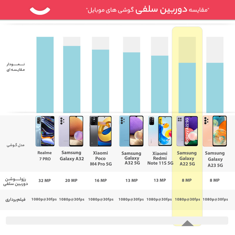 بدون شک یکی از سنسورهای دوربین بسیار محبوب در میان کاربران، سنسور دوربین فوق عریض است. این گوشی هم با بهره بردن از سنسور دوربین فوق عریض (ultra wide) 5 مگاپیکسلی، امکان ثبت تصاویر با زاویه دید گستردهتر به نسبت سنسور دوربین اصلی را به شما میدهد. البته در تصاویر خروجی ثبت شده توسط سنسور دوربین فوق عریض، جزئیات بهخوبی خروجی تصاویر سنسور دوربین اصلی نمایش داده نمیشود اما بسیار مناسب برای ثبت تصاویر در طبیعت و عکسهای گروهی است. در بخش فیملبرداری هم این گوشی توانایی ضبط ویدیو با حداکثر کیفیت 1152p و نرخ 30 فریم در ثانیه را دارد. شاید بهتر بود که سامسونگ توانایی ضبط ویدیو با حداکثر کیفیت 4K را برای گلکسی5G A22 در نظر میگرفت. برای دوربین سلفی هم سنسور 8 مگاپیکسلی با گشودگی دریچه دیافراگم f/2.0 در نظر گرفته شده که توانایی ضبط ویدیو با حداکثر کیفیت 1080p و سرعت 30 فریم در ثانیه را دارد. سنسور دوربین سلفی برای ثبت تصاویر در نور روز عملکرد مناسب و قابل قبولی دارد اما در نور شب نباید چندان توقع عملکرد بسیار خوب و حذف نویزهای موجود در نور شب را داشته باشید.