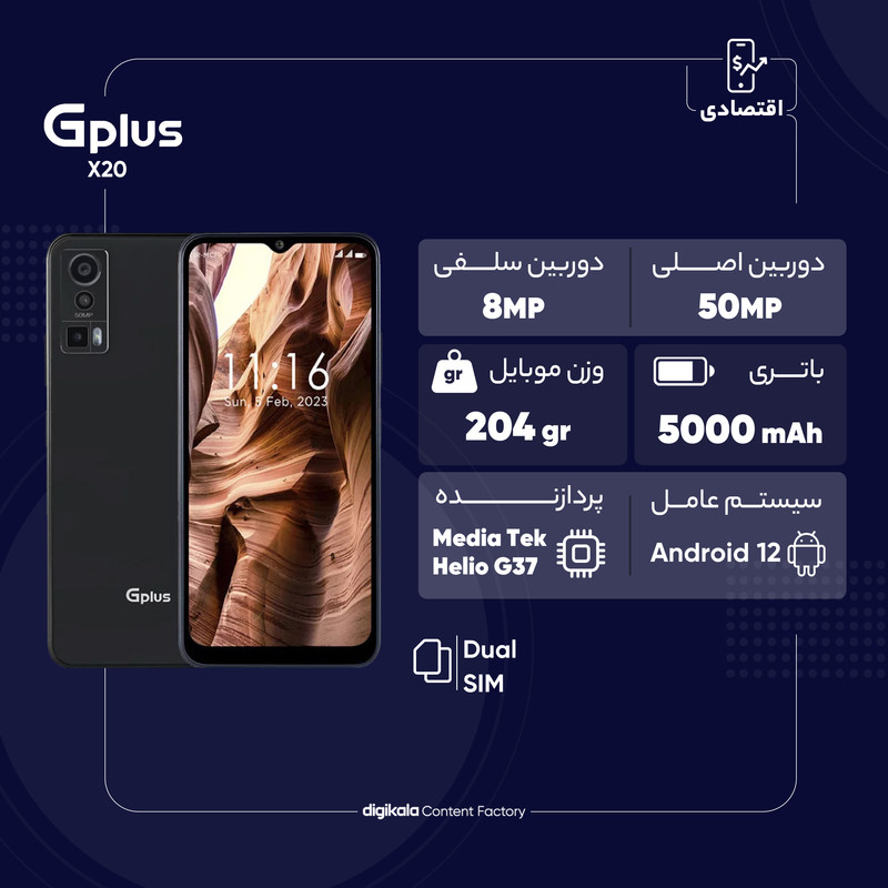 در بین گوشیهای هوشمند میانرده برند جیپلاس شاهد رونمایی برخی از محصولاتی بودیم که به نسبت قیمت در نظر گرفته شده از مشخصات فنی مناسب و بسیار قابل قبولی بهره برده بودند. جیپلاس X20 هم یکی از این گوشیهای هوشمند است. صفحهنمایش 6.5 اینچی این گوشی با رزولوشن 720×1600 پیکسل از نوع IPS در شرایط نوری متنوع وضوح تصویر مناسب و قابل قبولی را ارائه میکند. در قسمت پشتی هم یک سنسور 50 مگاپیکسل از نوع عریض در کنار دو سنسور 2 مگاپیکسل از نوع سنجش عمق و ماکرو، سنسورهای دوربین سهگانه این گوشی را تشکیل میدهند که در جایگاه یک گوشی میانرده در نور روز و نور شب عملکرد کاملا قابل قبولی دارد. برای دوربین سلفی هم سنسور با رزولوشن 8 مگاپیکسل در نظر گرفته شده که در نور روز عملکرد خوبی دارد. در بخش مشخصات سختافزاری هم حضور پردازنده هلیو G37 شرکت مدیاتک سبب شده تا جیپلاس X20 عملکرد بسیار خوبی در اجرای بازیهای محبوب و نرمافزارهای کاربردی دارد. باتری با میزان ظرفیت 5000 میلیآمپرساعت هم به ازای هر بار شارژ صد درصدی، توانایی ارائه طول عمر مفید (زمان آماده بهکار) دو روز را در شرایط استفاده معمولی دارد. در مجموع اگر به دنبال خرید گوشی میانرده با قیمت مقرون بهصرفهای هستید که مشخصات مناسب از جمله سنسور دوربین عریض قدرتمندی داشته باشد، جیپلاس X20 میتواند یکی از گزینههای بسیار خوب برای شما باشد.
