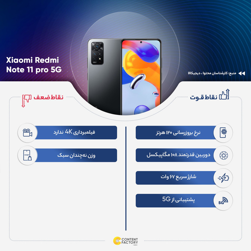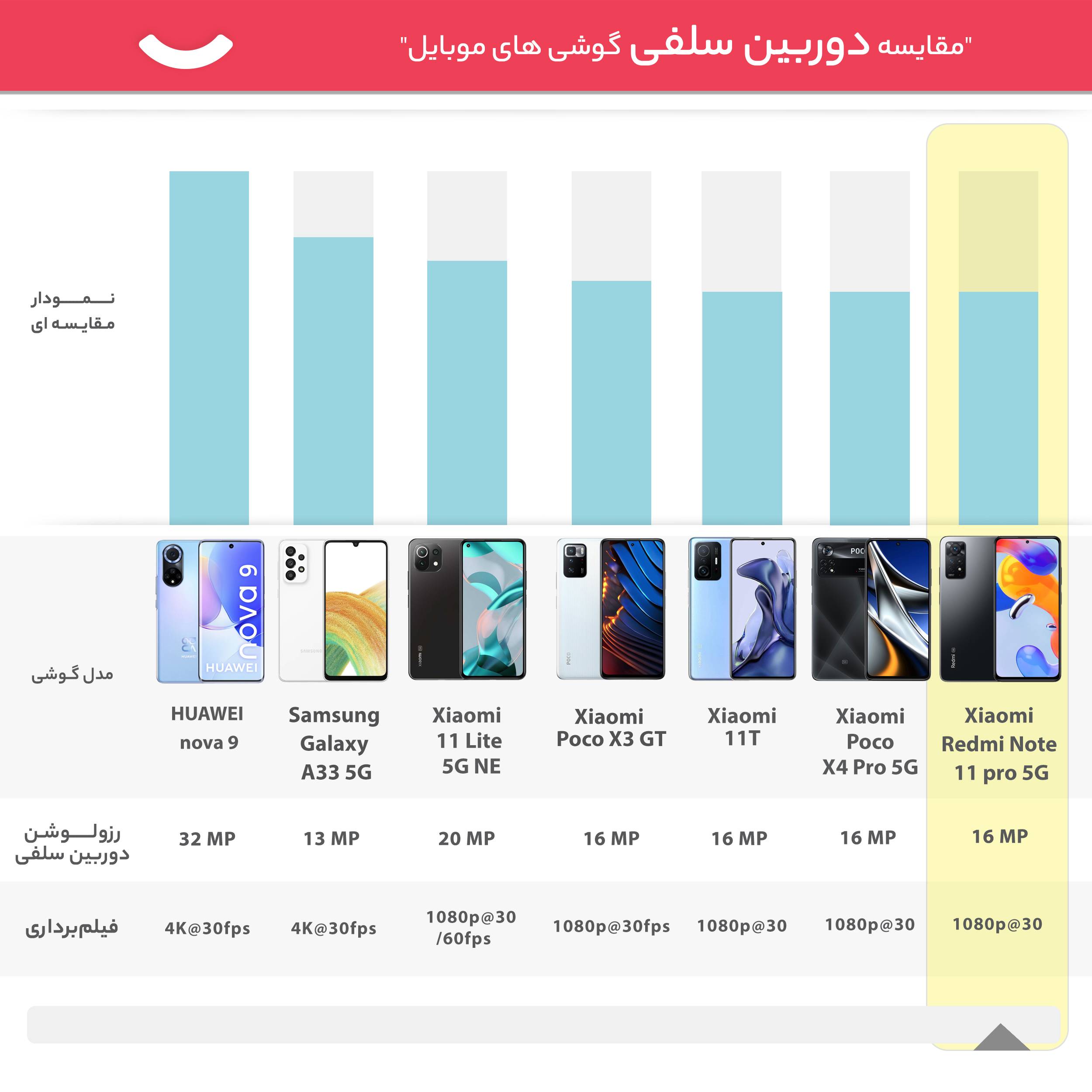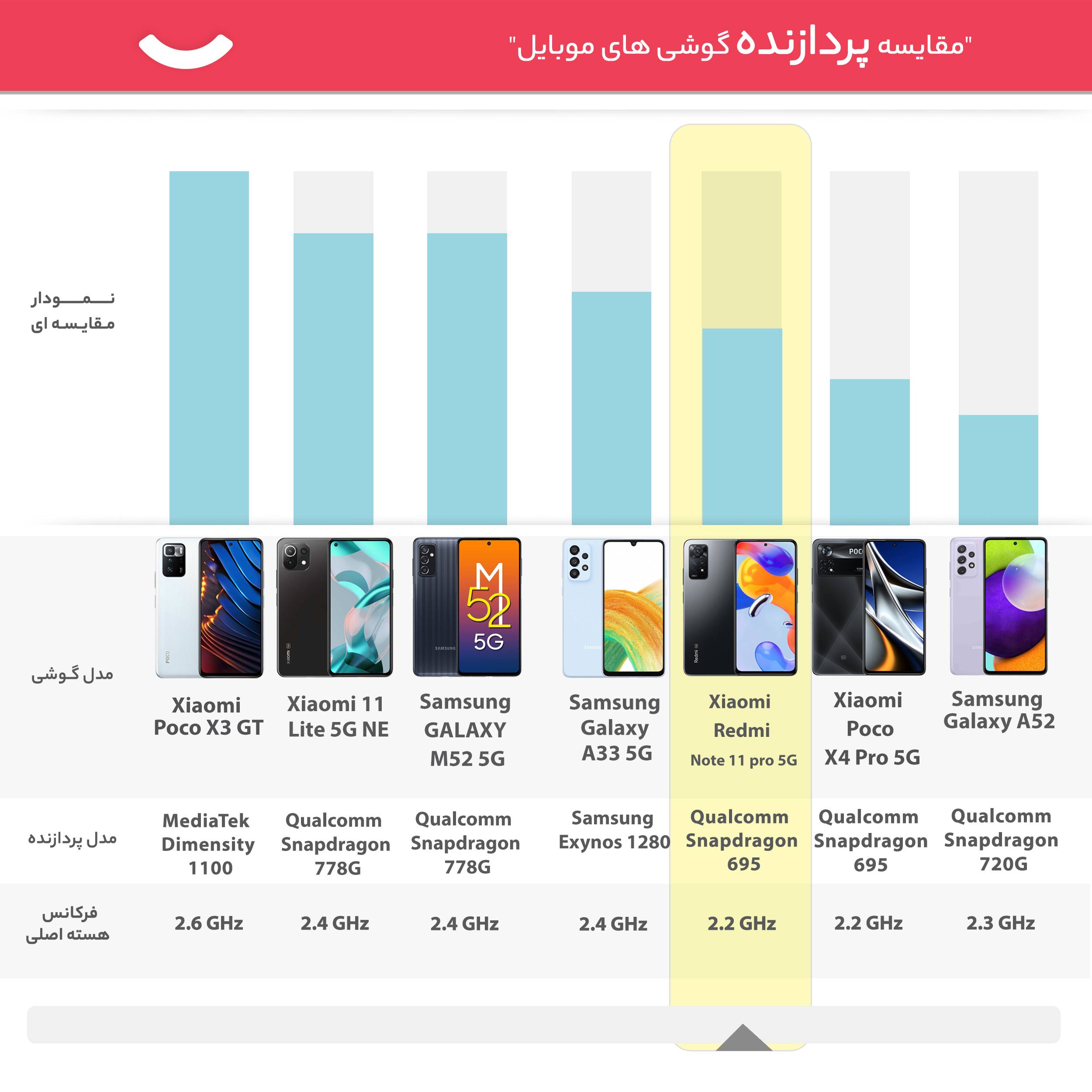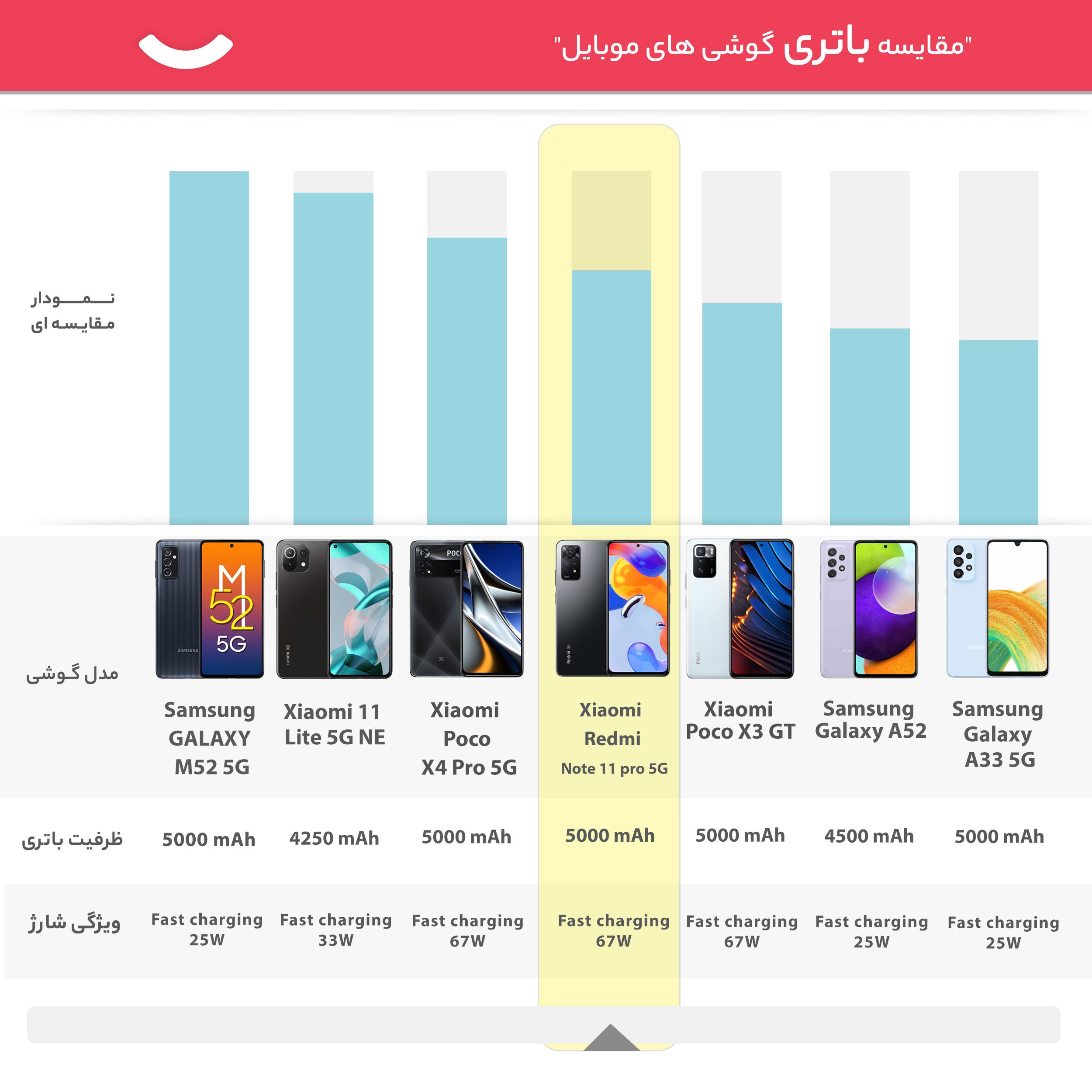 سری Redmi گوشیهای هوشمند میانرده شیائومی تا به امروز توانستهاند عملکرد بسیار خوب و قابل قبولی را بهنمایش بگذارند. شیائومی Redmi Note 11 pro 5G یکی از گوشیهای هوشمند میانرده قدرتمند این شرکت است. طراحی در نظر گرفته شده برای این گوشی هوشمند سعی دارد تا خود را بهعنوان یک گوشی رده بالا و پرچمدار معرفی کند و حتی در برخی از مشخصات فنی در نظر گرفته شده هم چیزی کم از یک پرچمدار ندارد. در نمای روبهرویی این گوشی، به صفحهنمایش با ابعاد 6.67 اینچ و رزولوشن 1080×2400 پیکسل و توانایی نمایش 395 پیکسل در هر اینچ از نوع سوپرامولد مجهز شده است. صفحهنمایش بسیار قدرتمند، توانایی ارائه نرخ بروزرسانی 120 هرتز و حداکثر روشنایی 1200 نیت (شمع در متر مربع) را دارد. در بخش سنسورهای دروبین هم شیائومی Redmi Note 11 pro 5G قدرتمند وارد میدان رقابت شده است. یک سنسور دوربین اصلی قدرتمند با رزولوشن 108 مگاپیکسل از نوع عریض (wide) در کنار سنسور 8 مگاپیکسل از نوع فوق عریض (ultrawide) و سنسور 2 مگاپیکسل ماکرو، سنسورهای دروبین سهگانه این گوشی میانرده را تشکیل میدهند. بریدگی دایرهای شکل ناچ در قسمت بالایی و مرکزی صفحهنمایش هم، سنسور دوربین سلفی با رزولوشن 16 مگاپیکسل را در خود جای داده است. حضور پردازنده قدرتمند اسنپدراگون 695 5G شرکت کوالکام هم سبب شده تا Redmi Note 11 pro 5G بهخوبی از پس اجرای بازیهای سنگین و محبوبی مثل کالآفدیوتی موبایل برمیآيد و البته از شبکههای اینترنتی پرسرعت نسل پنجم یا همان 5G هم پشتیبانی میکند. باتری 5000 میلیآمپرساعت در کنار شارژر قدرتمند 67 واتی مجهز به تکنولوژی شارژ سریع از دیگر مشخصات در نظر گرفته شده برای این گوشی هوشمند میانرده است. گفتنی است شارژر 67 واتی، توانایی شارژ صفر تا صد درصدی باتری این گوشی را در مدت زمان 42 دقیقه دارد.