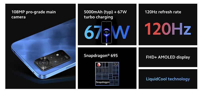 در بخش مشخصات سختافزاری اما همانطور که در ابتدا اشاره داشتیم، این گوشی به پردازنده قدرتمندتری به نسبت نسخه 4G مجهز شده است. پردازنده اسنپدراگون 695 5G بهعنوان یکی از پردازندههای میانرده مناسب شرکت کوالکام، این گوشی میانرده را همراهی میکند. دو هسته قدرتمندتر با توانایی ارائه حداکثر فرکانس کاری ۲.۲ گیگاهرتز در کنار شش هسته اقتصادی با صرفهانرژی کمتر و توانایی ارائه فرکانس کاری ۱.۷ گیگاهرتز، هشت هسته این پردازنده میانرده را تشکیل میدهند. این پردازنده در کنار عملکرد کاملا قابلی قبول در اجرای بازی، توانایی پشتیبانی از شبکههای اینترنتی نسل پنجم یا همان 5G را هم دارد. باتری قدرتمند با میزان ظرفیت ۵۰۰۰ میلیآمپرساعت هم به ازای هر بار شارژ صد درصدی در مصرف معمولی، توانایی ارائه طول عمر مفید (زمان آماده بهکار) نزدیک به دو روز را دارد. اما این گوشی از شارژر قدرتمند با توان ۶۷ وات بهره برده است. شارژر که با بهره بردن از فناوری شارژ سریع، توانایی شارژ صفر تا ۵۱ درصدی باتری این گوشی میانرده در مدت زمان بسیار کوتاه ۱۵ دقیقه و شارژ صد درصدی در مدت زمان ۴۲ دقیقهای را دارد.