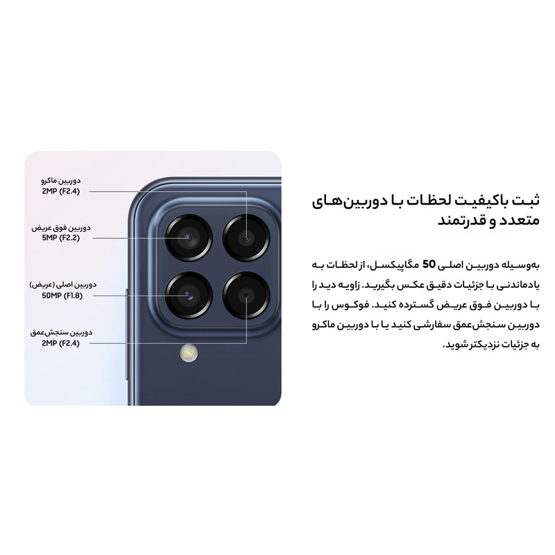 گوشیهای میانرده سری A سامسونگ همواره توانستهاند با بهره بردن از مشخصات فنی مناسب در کنار قیمتی مقرون بهصرفه، عملکرد قابل قبولی را از خود بهنمایش بگذارند. سامسونگ Galaxy M33 5G SM-M336BU/DS هم یکی از گوشیهای هوشمند میانرده باکیفیت این سری است. طراحی کلی در نظر گرفته شده برای این گوشی طراحی آشنایی است و در نمای روبهرویی به صفحهنمایش با ابعاد 6.6 اینچ و رزولوشن 1080×2408 پیکسل از نوع TFT LCD مجهز شده است. با توجه به توانایی نمایش 400 پیکسل در هر اینچ و حداکثر نرخ بروزرسانی 120 هرتز، نشان از آن دارد که با صفحهنمایش باکیفیتی روبهرو هستیم. بریدگی قطرهای شکل ناچ در قسمت بالایی و مرکزی صفحهنمایش، سنسور دوربین سلفی با رزولوشن 8 مگاپیکسل را در خود جای داده که برای ثبت تصاویر در نور روز و تماسهای تصویری، عملکرد قابل قبولی دارد. در قسمت پشتی هم یک سنسور دوربین اصلی با رزولوشن 50 مگاپیکسل از نوع عریض (wide) در کنار سنسور 5 مگاپیکسل از نوع فوق عریض (ultrawide) در کنار دو سنسور با رزولوشن 2 مگاپیکسل از نوع سنجش عمق و ماکرو، سنسورهای دوربین چهارگانه سامسونگ Galaxy M33 SM-M336BU/DS را تشکیل میدهند. توانایی ضبط ویدیو با حداکثر کیفیت 4K سبب شده تا عملکرد خوبی را از سنسور دوربین این گوشی هوشمند میانرده در بخش فیلمبرداری شاهد باشید. Galaxy M33 5G SM-M336BU/DS به پردازنده اختصاصی اگزینوس 1280 شرکت سامسونگ مجهز شده است که توانایی ارائه عملکرد کاملا قابل قبولی را در اجرای بازیهای سنگین (مثل کالآفدیوتی موبایل و آسفالت 9) و نرمافزارهای محبوب و کاربردی دارد. همانند اکثر گوشیهای هوشمند میانرده سری A، سامسونگ Galaxy M33 5G SM-M336BU/DS هم به باتری قدرتمندی با میزان ظرفیت 6000 میلیآمپرساعت مجهز شده که در شرایط استفاده معمولی به ازای هر بار شارژ صد درصدی، طول عمر مفید (زمان آماده بهکار) دو روز را ارائه میکند. گوشیهای اکتیو هم به این شکل هستند که به دلیل محدودیتهای برخی از محصولات برای کشور ایران، در کشورهای همسایه بهصورت رسمی با یک بار قرار گرفتن سیمکارت، اکتیو شده تا امکان استفاده در کشور وجود داشته باشد و پلمپ میشوند و باید بدانید که این پروسه هیچ مشکلی در راستای گارانتی کالا بههمراه ندارد.