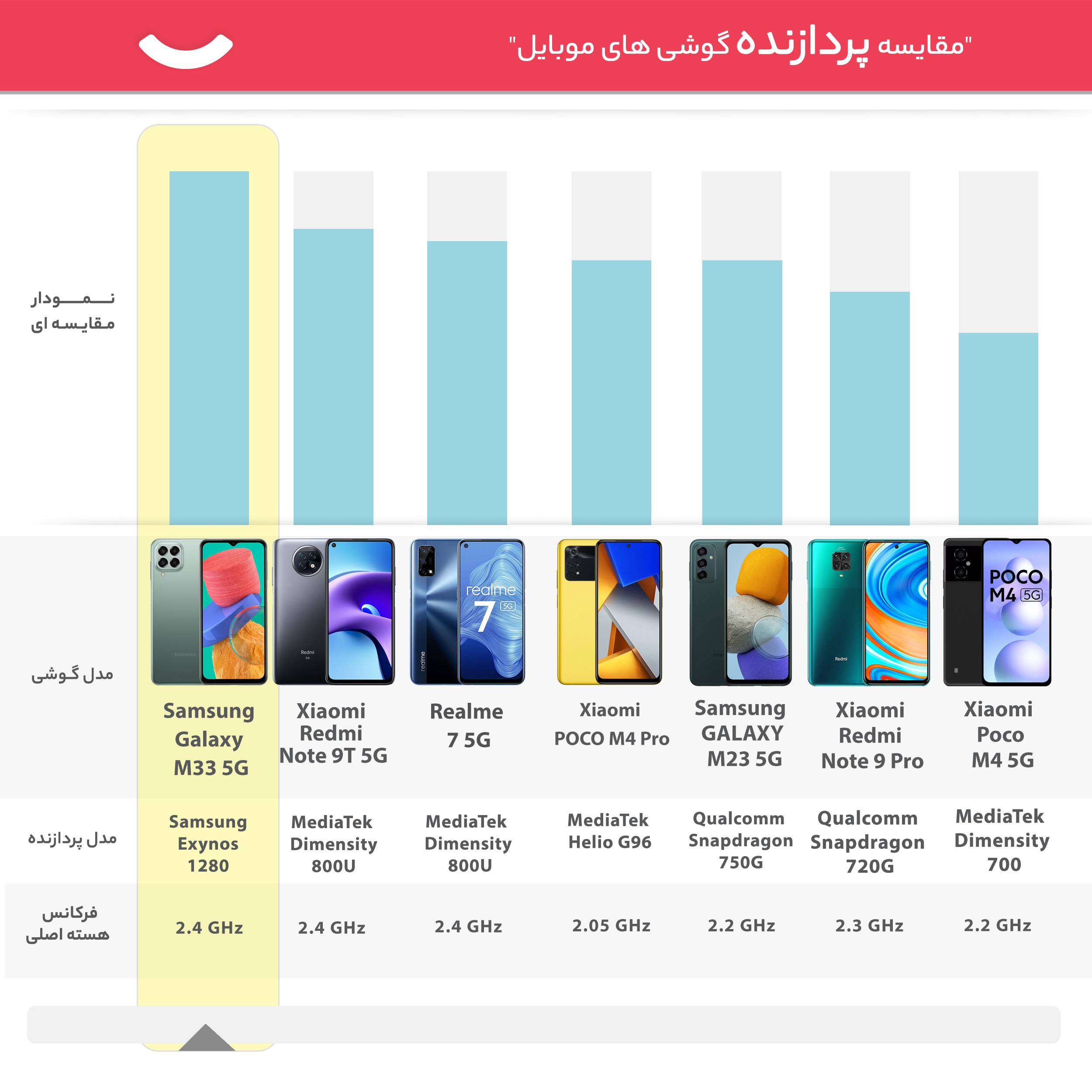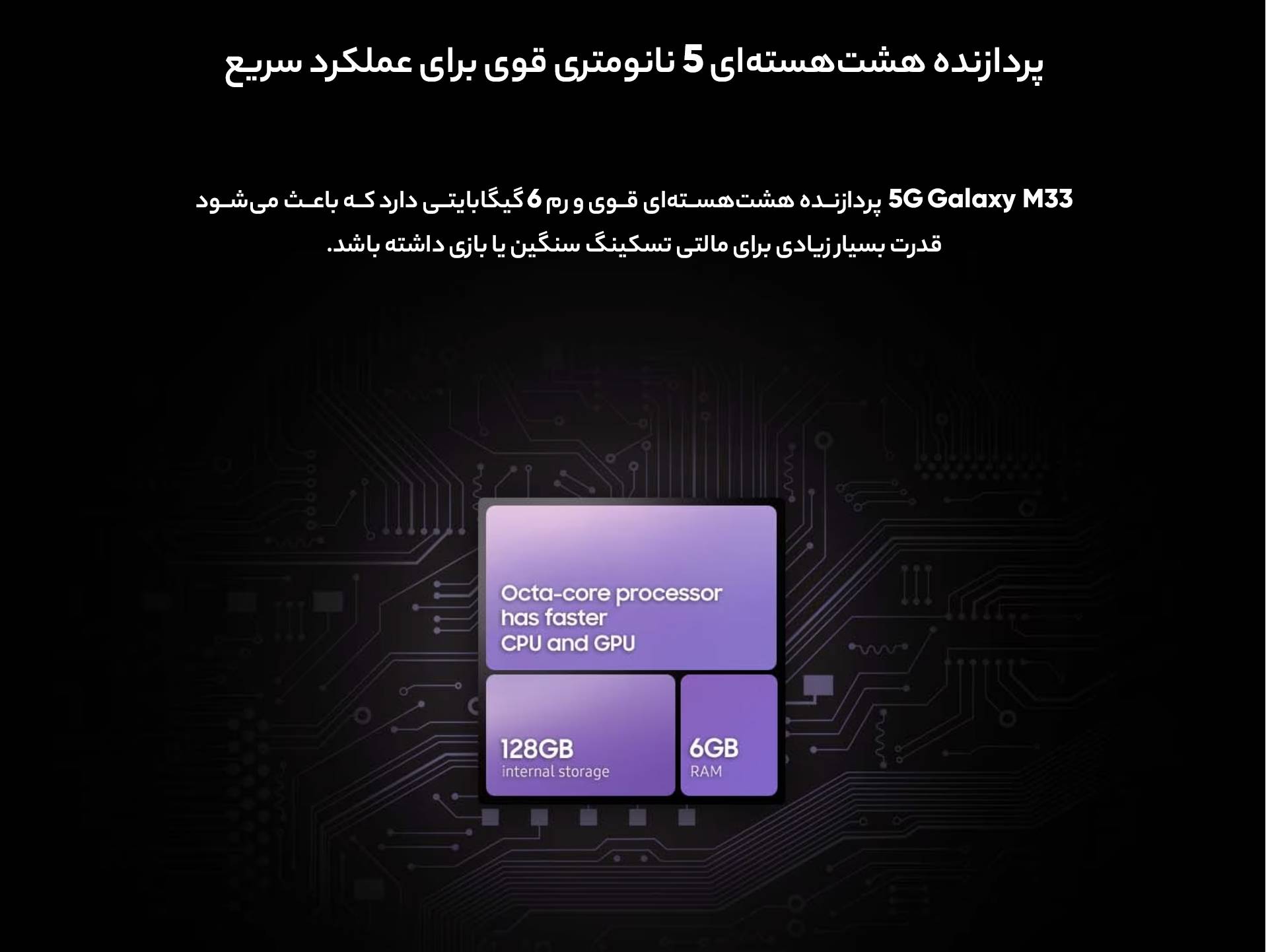 در بخش مشخصات سختافزاری، Galaxy M33 5G به پردازنده اختصاصی اگزینوس ۱۲۸۰ سامسونگ مجهز شده است. پردازندهای با معماری ۵ نانومتری که در بهترین حالت ممکن توانایی ارائه فرکانس کاری ۲.۴ گیگاهرتز را دارد. با این تفاسیر باید بدانید که این گوشی میانرده، در اجرای بازیهای حتی سنگین مثل کالآفدیوتی موبایل و آسفالت ۹، توانایی ارائه عملکرد کاملا قابل قبول و بدون لگ را دارد. باتری با میزان ظرفیت 6000 میلیآمپرساعت این گوشی هم به ازای هر بار شارژ صد درصدی، توانایی ارائه طول عمر مفید (زمان آماده بهکار) دو روز را در شرایط استفاده معمولی دارد. باید بدانید که متاسفانه این گوشی همانند برخی از پرچمداران جدید، از داشتن آداپتور شارژر محروم است و خبری از آداپتور شارژر درون جعبه نیست. اما توانایی پشتیبانی از فناوری شارژ سریع با توان ۲۵ وات و همچنین شارژ معکوس را دارد.