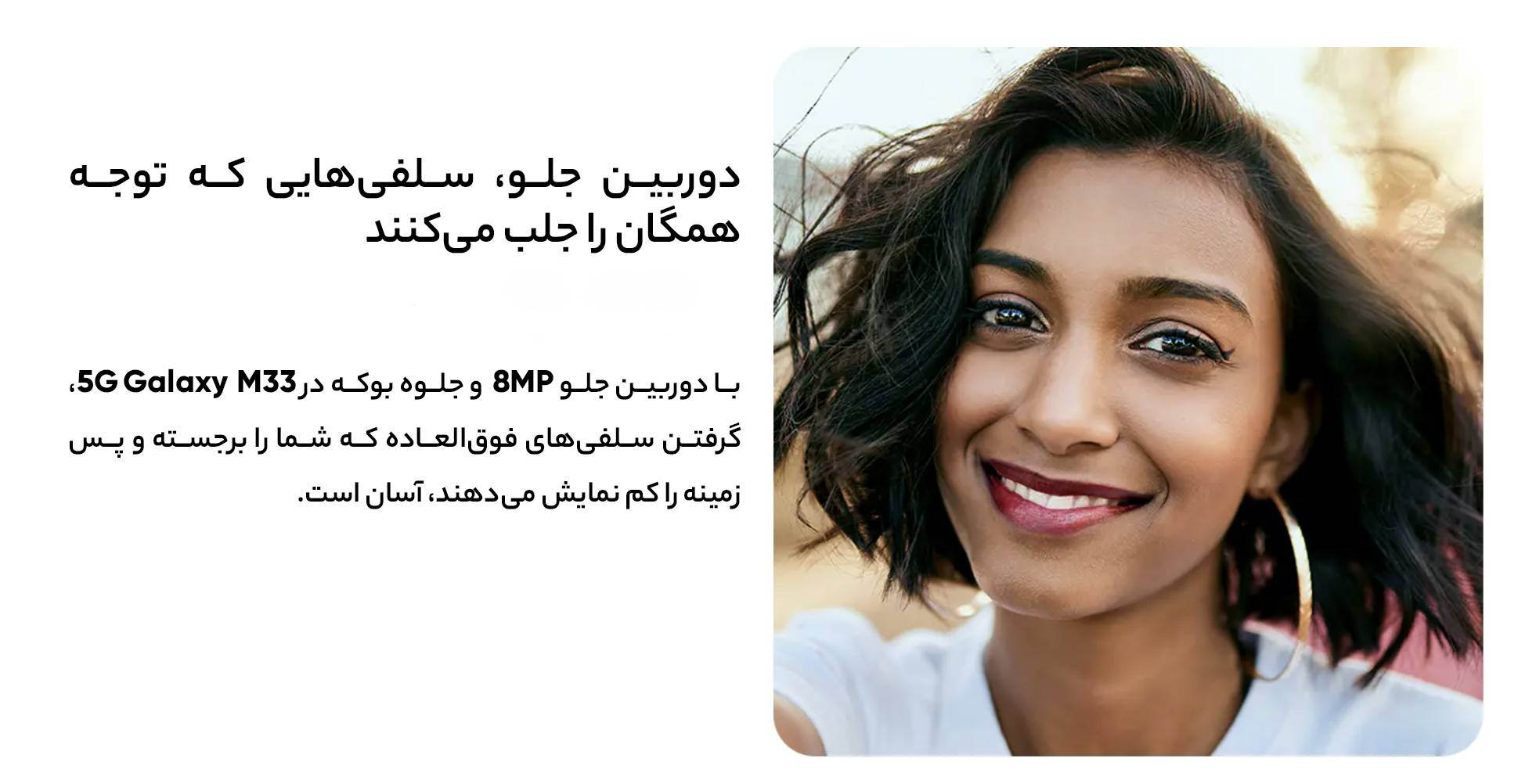 سنسور دوربین فوق عریض (ultrawide) با رزولوشن ۵ مگاپیکسل هم این گوشی را همراهی میکند. سنسوری با زاویه دید گسترده ۱۲۳ درجه که بسیار مناسب برای عکاسی در طبیعت و عکسهای دسته جمعی است که شما به زاویه دید گستردهتری به نسبت سنسور دوربین اصلی نیاز دارید. البته همینجا باید بدانید که با توجه به میزان رزولوشن در نظر گرفته شده برای این سنسور، نباید توقع نمایش جزئیات بسیار بالایی در تصاویر خروجی ثبت شده داشته باشید. در نور شب هم نویزهای موجود در نور شب، کیفیت تصاویر خروجی را تحت تاثیر قرار میدهند اما برای ثبت تصاویر در نور روز عملکرد مناسبی دارد. سنسور ماکرو ۲ مگاپیکسل هم برای ثبت تصاویر از فاصله نزدیک در نظر گرفته شده و سنسور سنجش عمق ۲ مگاپیکسل هم کمک شایانی به سنسور دوربین اصلی در ثبت تصاویر حالت پرتره کرده است. در بخش فیلمبرداری اما سامسونگ Galaxy M33 5G با توجه به بهره بردن از سنسور دوربین قدرتمند، توانایی ضبط ویدیو با حداکثر کیفیت 4K و سرعت ۳۰ فریم را دارد. برای دوربین سلفی هم سنسور با رزولوشن ۸ مگاپیکسل در نظر گرفته شده است که توانایی ثبت تصاویر قابل قبولی را در حد اندازه میزان رزولوشن در نظر گرفته شده دارد. در نور روز عملکرد خوبی دارد این سنسور، اما در نور شب و نور کم، نباید توقع حذف نویزهای موجود در نور شب و خروجی تصاویر روشنی را داشته باشید.