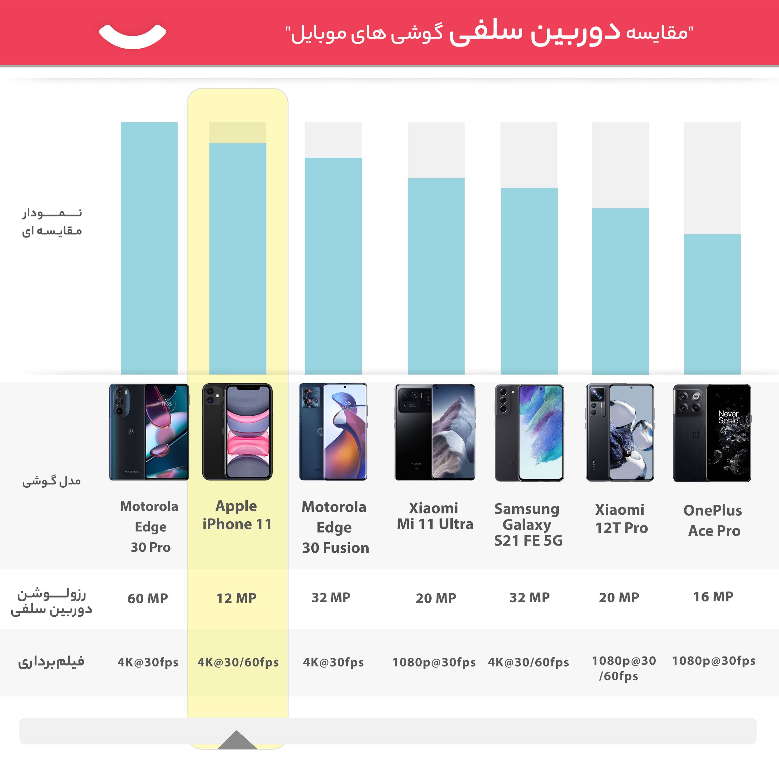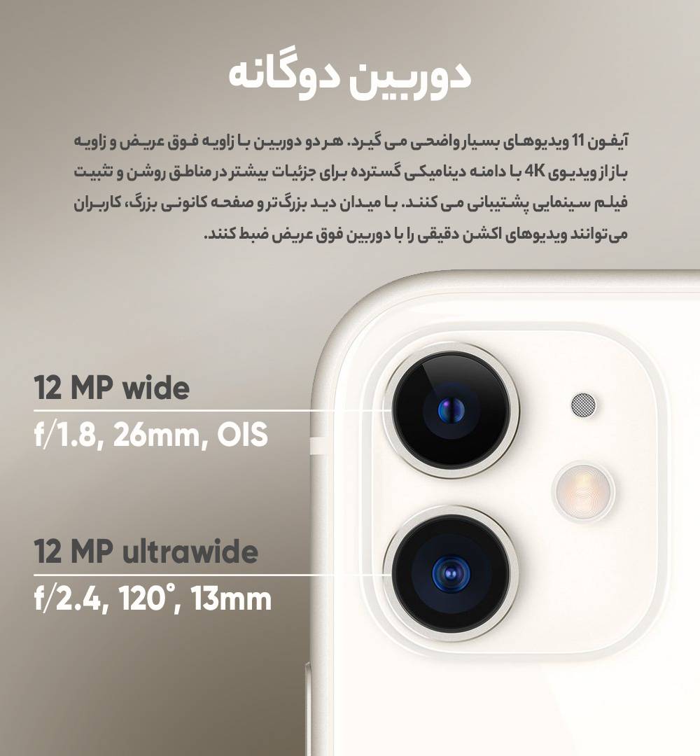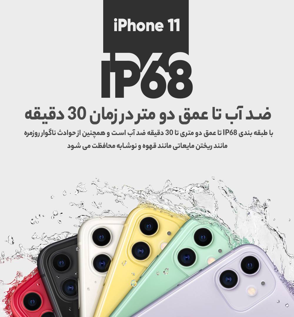 گوشی موبایل «iPhone 11» یکی از سه گوشی شرکت اپل است که در کنفرانس سال 2019 این شرکت معرفی شد. این گوشی نسبت به گوشیهای Pro و Pro Max قیمت پایینتری دارد اما طراحی مشابهی با این محصولات دارد. یکی از اصلیترین تفاوتهای این گوشی با دو گوشی دیگر، نمایشگر آیفون 11 است به فناوری Liquid Retina مجهز شده است تا قیمت تمام شده کمتری داشته باشد. البته این نمایشگر رزولوشن رضایتبخشی دارد؛ بهطوریکه در اندازهی 6.1 اینچیاش، حدود 326 پیکسل را در هر اینچ جا داده است که میزان مطلوبی به حساب میآید. قاب پشتی آیفون جدید هم از شیشه ساخته شده تا هم گوشی مشکل آنتندهی نداشته باشد و هم امکان شارژ بیسیم باتری در این گوشی وجود داشته باشد. البته قابی آلومینیومی این بدنه شیشهای را در خود جای داده است. این بدنهی زیبا در مقابل خطوخش مقاومت زیادی دارد؛ پس خیالتان از این بابت که آب و گردوغبار بهراحتی روی آیفون 11 تأثیر نمیگذارد، راحت باشد. علاوهبراین لکه و چربی هم روی این صفحهنمایش باکیفیت تأثیر چندانی ندارند اما این هم پایان کار نیست، آیفون جدید میتواند به مدت 30 دقیقه در عمق 2 متری آب دوام بیاورد. تشخیص چهره با استفاده از دوربین جلو دیگر ویژگی است که در آیفون جدید اپل به کار گرفته شده است. اما جالبترین و واضحترین تفاوت در این محصول جدید، دوربینهایی است که به شکل دوگانه در قاب پشتی جا خوش کردهاند. دو دوربین با سنسورهای 12مگاپیکسلی عکسهایی با کیفیتِ کاملاً رضایتبخش را به کاربر هدیه میدهد. دو دوربین که یکی از آنها SL سهبعدی است هم دیگر بهروزرسانی در آیفون 11 است. قابلیت اتصال به شبکههای 4G، بلوتوث نسخهی 5، نسخهی 13 از iOS دیگر ویژگیهای این گوشی هستند. ازنظر سختافزاری هم این گوشی از تراشهی جدید A13 بهره میبرد که تا بتواند علاوه بر کارهای معمول، از قابلیتهای جدید واقعیت مجازی که اپل این روزها روی آن تمرکز خاصی دارد، پشتیبانی کند. گوشی جدید اپل به باتری 3110 میلیآمپرساعتی، فناوری شارژ سریع PD2.0، فناوری شارژ بیسیم و استاندارد صوتی دالبی هم مجهز شده است. پارت نامبر این محصول ZAA است.