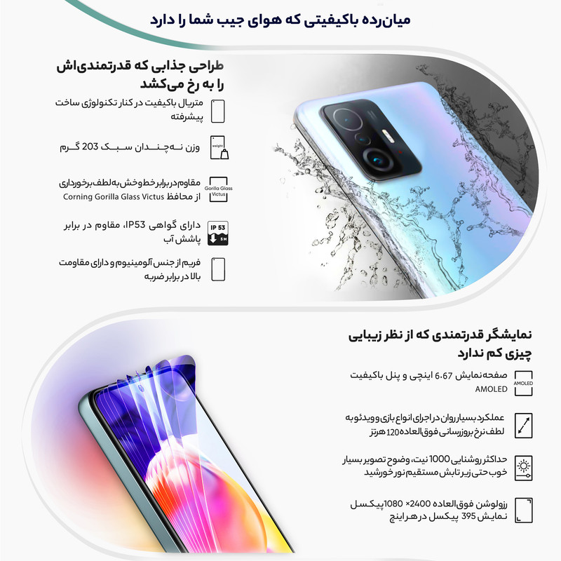 بدون شک با توجه به مشخصات در نظر گرفته شده برای صفحهنمایش، شیائومی 11T در مقایسه با بسیاری از گوشیهای موجود در بازار، به یکی از قدرتمندترین صفحاتنمایش مجهز شده است. این گوشی هوشمند به صفحهنمایش با ابعاد 6.67 اینچ و رزولوشن 1080×2400 پیکسل از نوع امولد مجهز شده است. این صفحهنمایش توانایی نمایش 395 پیکسل در هر اینچ را دارد. همانطور که اشاره کردیم، حال با توجه به مشخصات در نظر گرفته شده هم قطعا متوجه شدهاید که با صفحهنمایش قدرتمند و بسیار زیبایی روبهرو هستید. اما هنوز مشخصات قدرتمند این صفحهنمایش تمام نشده است و باید بدانید که این صفحهنمایش توانایی ارائه نرخ بروزرسانی 120 هرتز را هم دارد. بهره بردن از چنین نرخ بروزرسانی بالایی سبب خواهد شد تا برای مثال در گیمپلی و تماشای ویدیوهای باکیفیت، عملکرد بهتری را به نسبت صفحاتنمایش با نرخ بروزرسانی 90 و 60 هرتز داشته باشد. حداکثر روشنایی 1000 نیت (شمع در متر مربع) هم سبب شده تا در شرایط نوری متنوع و حتی زیر تابش مستقیم نور خورشید، شاهد وضوح تصویر بسیار خوب و باکیفیتی باشید. از طرفی Corning Gorilla Glass Victus بهعنوان یکی از باکیفیتترین محافظهای صفحهنمایش، بهخوبی از صفحهنمایش این گوشی هوشمند در برابر افتادنهای و ضربات احتمالی محافظت میکند.