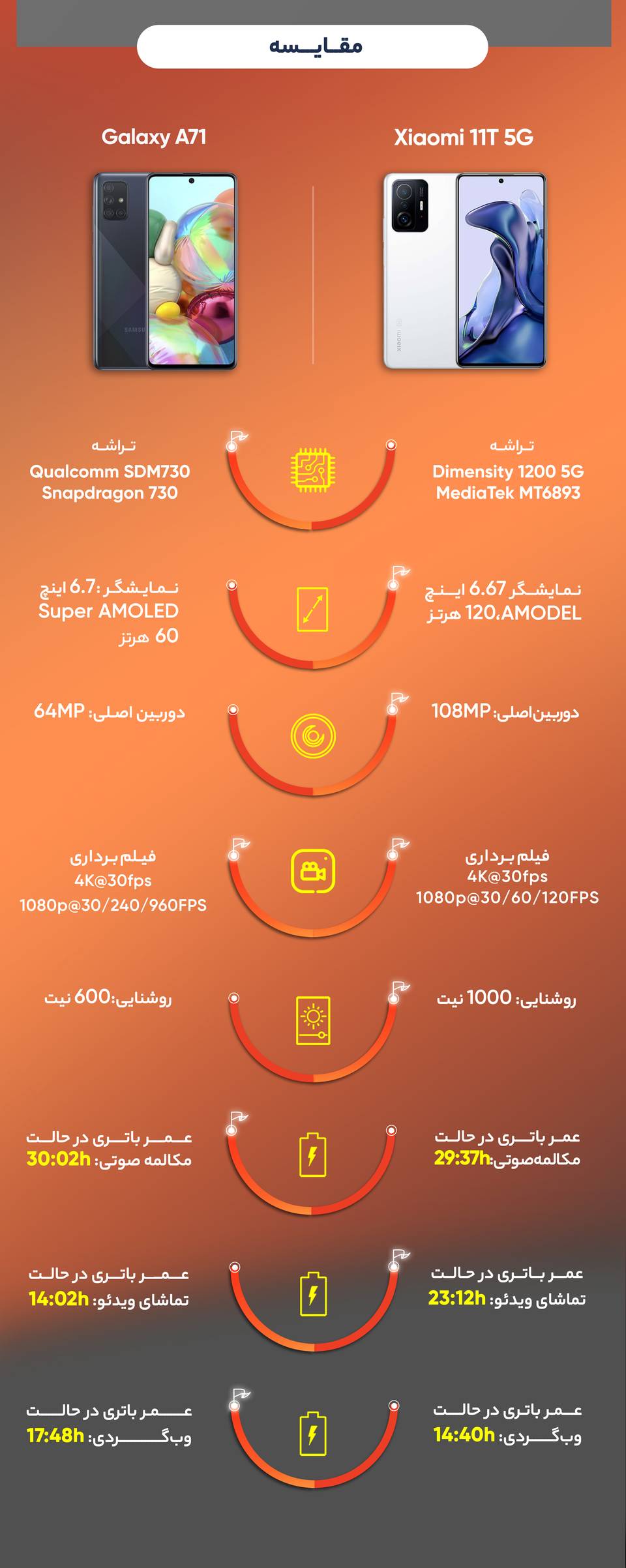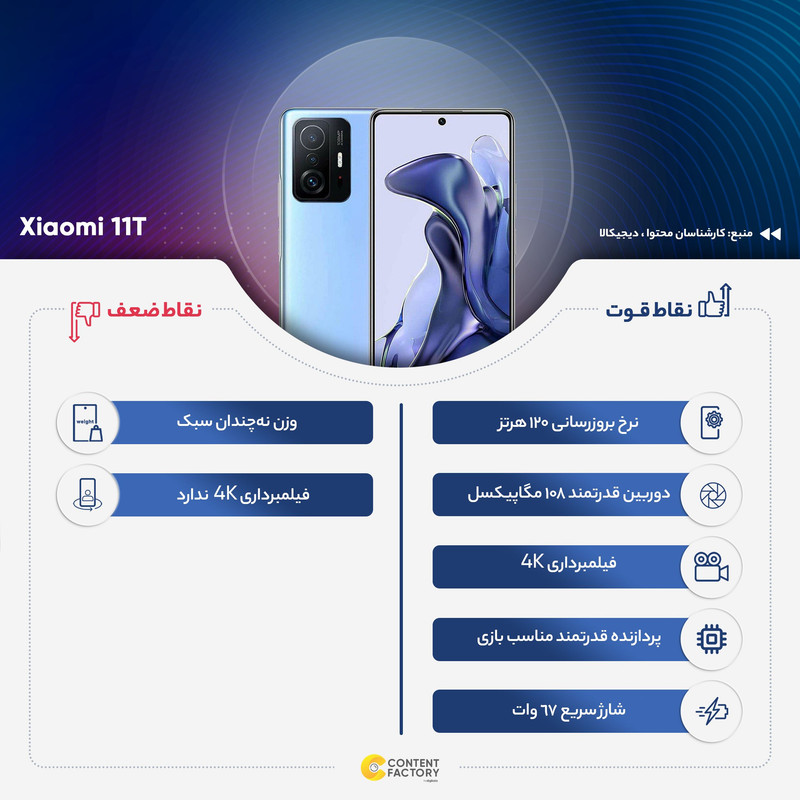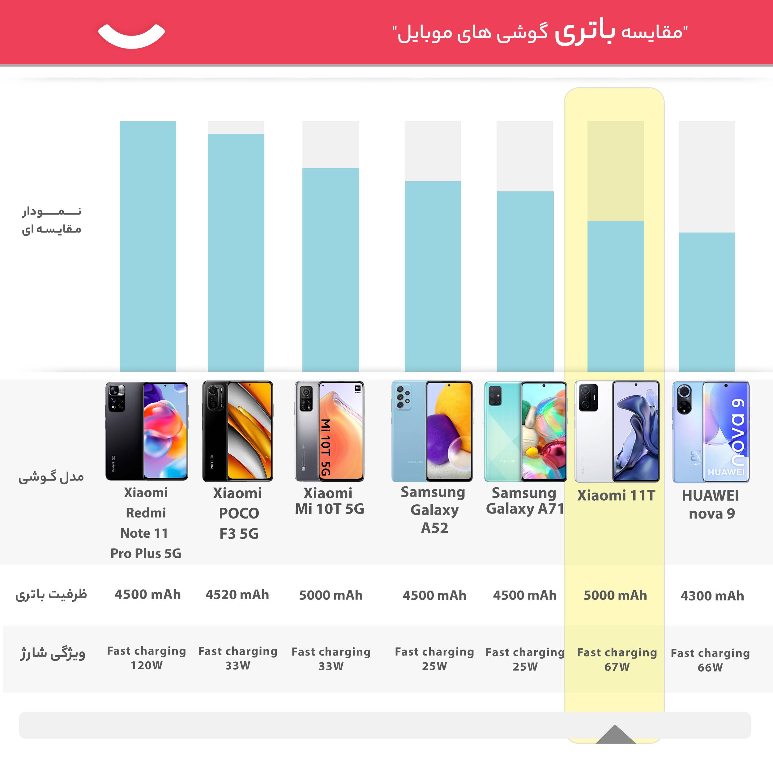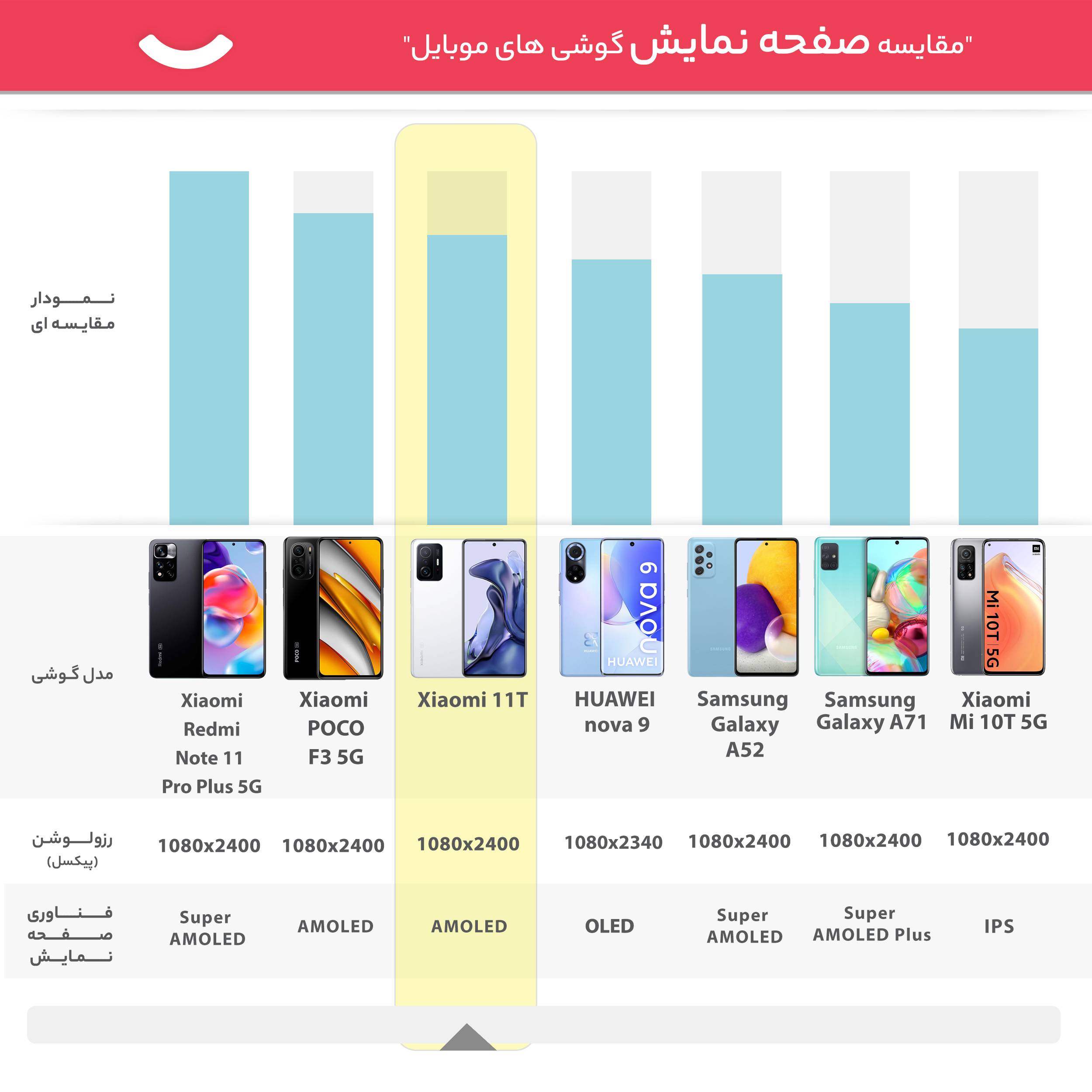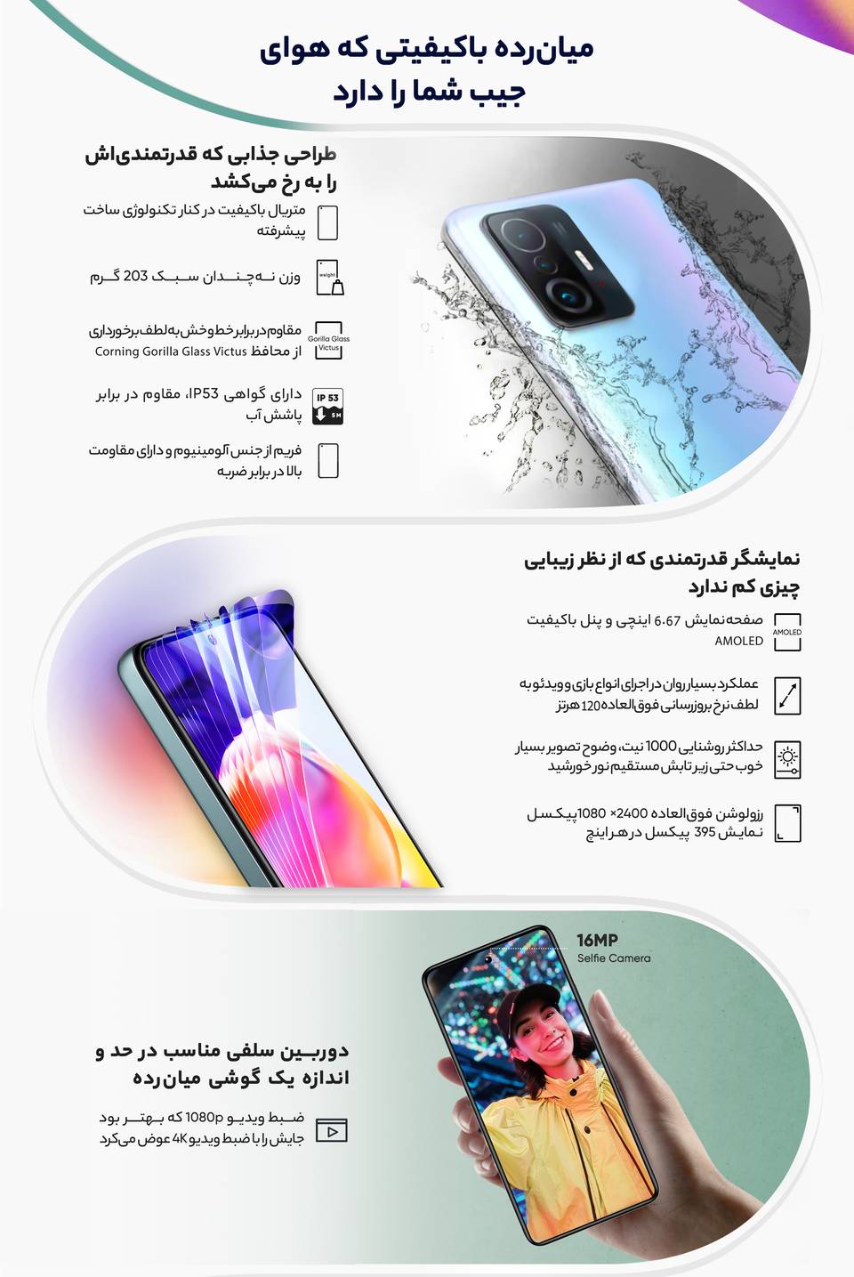 شرکت شیائومی در چند سال اخیر عملکرد بسیار درخشانی در زمینه گوشیهای هوشمند بهنمایش گذاشته است و عملکرد بسیار خوب این شرکت سبب شد تا کاربران زیادی را به سمت خود جلب کند. شیائومی 11T یکی از گوشیهای هوشمند بسیار باکیفیت این شرکت است که به مشخصات فنی قدرتمندی مجهز شده است. در همان نگاه اول طراحی در نظر گرفته شده برای این گوشی نشان از آن دارد که با گوشی هوشمند قدرتمند و بسیار باکیفیتی روبهرو هستیم. شیائومی 11T به صفحهنمایش 6.67 اینچ با رزولوشن 1080×2400 پیکسل از نوع امولد مجهز شده است. صفحهنمایشی که توانایی نمایش 395 پیکسل در هر اینچ را دارد. توانایی ارائه نرخ بروزرسانی 120 هرتز نشان از آن دارد که با صفحهنمایش همه چیز تمامی روبهرو هستیم. در قسمت پشتی هم سه سنسور دوربین برای این گوشی در نظر گرفته شده است. یک سنسور دوربین اصلی قدرتمند با رزولوشن 108 مگاپیکسل از نوع عریض با گشودگی دریچه دیافراگم f/1.8 در کنار سنسور 8 مگاپیکسل از نوع فوق عریض (ultra wide) و سنسور 5 مگاپیکسل از نوع تله فوتو ماکرو، سنسورهای دوربین سهگانه این گوشی هوشمند را تشکیل میدهند. برای دوربین سلفی هم سنسور با رزولوشن 16 مگاپیکسل در نظر گرفته شده است. سنسور دوربین اصلی 108 مگاپیکسل توانایی ضبط ویدیو با حداکثر کیفیت 4K و سرعت 30 فریم در ثانیه و سنسور دوربین سلفی هم توانایی ضبط ویدیو با حداکثر کیفیت 1080p و سرعت 30 فریم در ثانیه را دارند. در بخش مشخصات سختافزاری هم شیائومی 11T به یکی از قدرتمندترین پردازندههای شرکت مدیاتک یعنی دیمنسیتی 1200 5G مجهز شده است. بهره بردن از چنین پردازندهای سبب شده تا با خیال راحت حتی سنگینترین بازیهای روز را هم اجرا کنید و عملکرد بسیار خوب و قابل قبولی را از این گوشی هوشمند شاهد باشید. این پردازنده توانایی پشتیبانی از شبکههای اینترنتی نسل پنجم یا همان 5G را هم دارد. شیائومی 11T به باتری با میزان ظرفیت 5000 میلیآمپرساعت مجهز شده است. حضور شارژر قدرتمند با توان 67 وات و پشتیبانی از فناوری شارژ سریع سبب شده تا در مدت زمان کوتاه 36 دقیقه، شارژ 0 تا 100 درصدی باتری این گوشی هوشمند انجام شود.