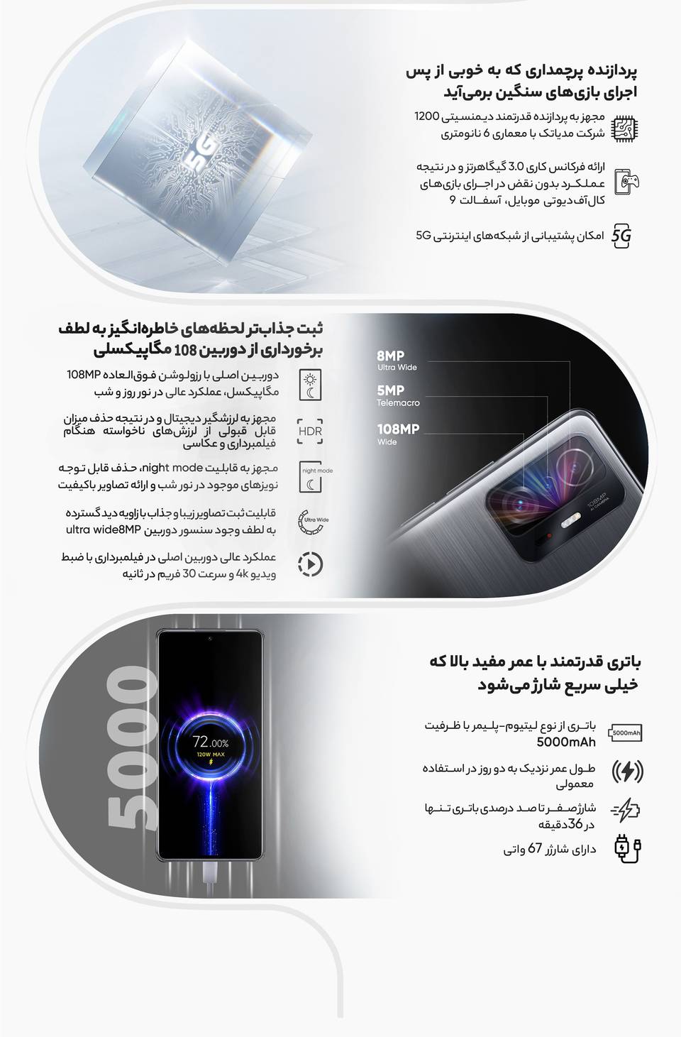 | مشخصات باتری | باتری از نوع لیتیوم-پلیمر با میزان ظرفیت 5000 میلیآمپرساعت شارژر 67 واتی مجهز به تکنولوژی شارژ سریع شارژ 0 تا 100 درصد در مدت زمان 36 دقیقه |