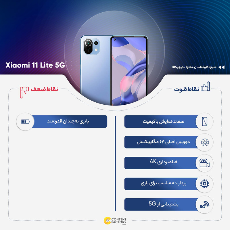 حضور سنسور پرکاربرد فوق عریض یا همان Ultra Wide هم امکان ثبت تصاویر با زاویه دید گسترده 119 درجه را فراهم کرده است. البته در تصاویر خروجی ثبت شده توسط این سنسور دوربین با توجه به میزان رزولوشن در نظر گرفته شده، نباید توقع نمایش جزئیات بسیار دقیقی را در تصاویر خروجی ثبت شده داشته باشید، اما کنتراست و داینامیک رنج کاملا قابل قبولی را به نمایش خواهد گذاشت. سنسور 5 مگاپیکسلی اما از نوع تله ماکرو است که هم توانایی ثبت تصاویر از فاصله نزدیک را دارد، هم میتواند در ثبت تصاویر حالت پرتره بسیار نقش مهمی داشته باشد. اما در بخش ویدیو هم این گوشی میانرده حرفهایی برای گفتن دارد. سنسور دوربین اصلی 64 مگاپیکسل توانایی ضبط ویدیو با حداکثر کیفیت 4K و سرعت 30 فریم در ثانیه را دارد. در این بخش، شیائومی 11 Lite 5G NE به قابلیت بسیار کاربردی لرزشگیر دیجیتال یا همان EIS مجهز شده است. قابلیتی که لرزشهای ناخواسته هنگام ضبط ویدیو را تا میزان قابل توجهی حذف میکند و در نهایت خروجی ویدیو باکیفیتی را ارائه میکند. برای دوربین سلفی هم سنسور با رزولوشن 20 مگاپیکسل در نظر گرفته شده که توانایی ضبط ویدیو با حداکثر کیفیت 1080p و نهایت سرعت 60 فریم در ثانیه را دارد.
