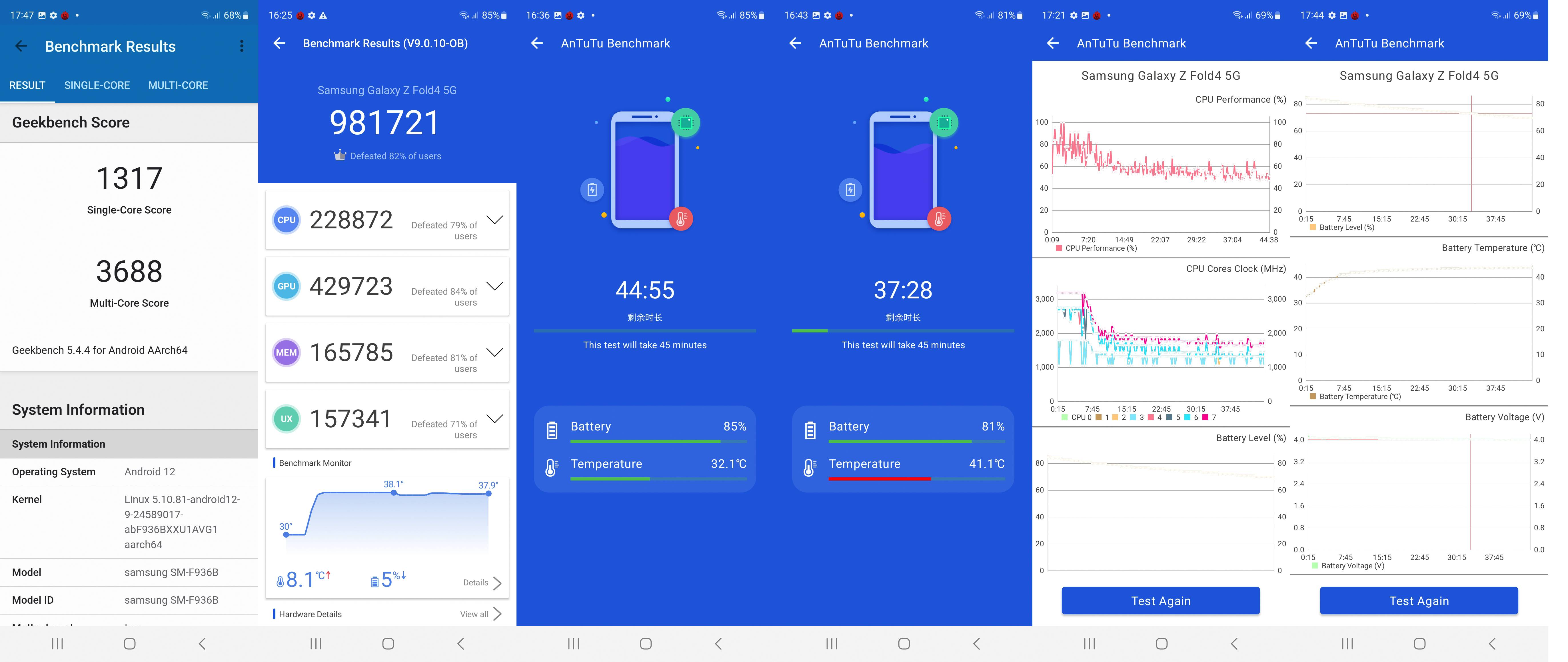 در بخش مشخصات سختافزاری هم سامسونگ Galaxy Z Fold4 کاملا لیاقت یک پرچمدار را دارد و دیگر خبری از پردازندههای اختصاصی اگزینوس سامسونگ نیست. پردازنده اسنپدراگون ۸ پلاس نسل یک شرکت کوالکام، این گوشی هوشمند خاص را همراهی میکند. پردازندهای که یک هسته قدرتمندتر با توانایی ارائه حداکثر فرکانس کاری ۳.۱۹ گیگاهرتز در کنار سه هسته با توانایی ارائه فرکانس کاری ۲.۷۵ گیگاهرتز و چهار هسته اقتصادی با صرفه انرژی کمتر و توانایی ارائه فرکانس کاری ۱.۸ گیگاهرتز، هشت هسته آن را تشکیل میدهند. با توجه به مشخصات هستههای در نظر گرفته شده وتستهای بنچمارک که میتوانید در تصاویر زیر نتایج را مشاهده کنید، باید بگوییم که سامسونگ Galaxy Z Fold4 توانایی ارائه عملکرد بسیار خوبی را در اجرای بازیهای سنگین و با گرافیک بالا مثل، کالآفدیوتی موبابل، آسفالت ۹ و PUBG موبایل دارد. در این بخش هم Galaxy Z Fold4 به پردازنده قدرتمندتری به نسبت Galaxy Z Fold3 مجهز شده است. حتی در ترافیک کاری بالا و تست استرس، این گوشی توانست کنترل دمای بسیار خوبی داشته باشد. هرچند سامسونگ Galaxy Z Fold4 همانند تمام گوشیهای هوشمند دیگر، برای کنترل دمای پردازنده در شرایط ترافیک کاری بالا، عملکرد پردازنده را کاهش داده است. اما باز هم در اجرای بازیهایی که به آنها اشاره کردیم، با ارائه عملکرد فوقالعاده، دمای مناسبی داشت.