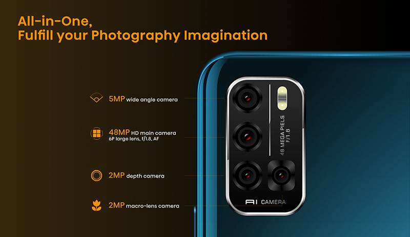 • دوربین 48 مگاپیکسل + 5 مگاپیکسل + 2 مگاپیکسل + 2 مگاپیکسل دوربین اول از نوع عریض (Wide) با رزولوشن 48 مگاپیکسل، دریچه‌ی دیافراگم f/1.8، سایز سنسور 1/2 اینچ و سایز پیکسل 0.8 میکرومتر دوربین دوم از نوع فوق عریض (ultrawide)، با رزولوشن 5 مگاپیکسل و زاویه دید 120 درجه دوربین سوم از نوع ماکرو (macro) با رزولوشن 2 مگاپیکسل دوربین چهارم از نوع سنجش عمق (depth) و رزولوشن 2 مگاپیکسل قابلیت عکاسی HDR قابلیت عکاسی پانوراما (Panorama)