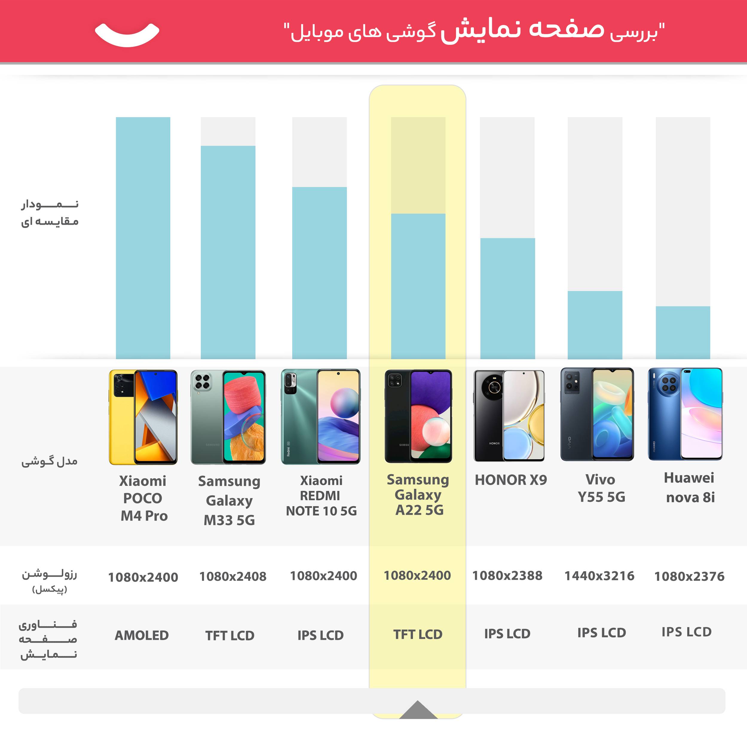 گوشیهای هوشمند میانرده سری A و M سامسونگ توانستهاند به نسبت رقبا عملکرد بهتری را به نمایش بگذارند. این گوشیهای هوشمند با بهره بردن از مشخصات فنی مناسب در کنار قیمت مقرون بهصرفه توانستند کاربران بسیاری را به سمت خود جلب کنند و فروش چشمگیری در بازار جهانی داشتهاند. سامسونگ گلکسی A22 5G هم یکی از محصولات باکیفیت این شرکت است که از مشخصات فنی بسیار خوبی در جایگاه یک گوشی میانرده بهره برده است. در نمای روبهرویی این گوشی به صفحهنمایش 6.6 اینچ با رزولوشن 1080×2400 پیکسل از نوع TFT مجهز شده است. توانایی ارائه نرخ بروزرسانی 90 هرتز، رزولوشن بسیار خوب و تراکم پیکسلی 399 پیکسل در هر اینچ، سبب شده تا این صفحهنمایش کیفیت بسیار خوب و قابل قبولی را ارائه کند. در قسمت پشتی هم یک سنسور دوربین اصلی با رزولوشن 48 مگاپیکسل و گشودگی دریچه دیافراگم f/1.8 از نوع عریض در کنار سنسور 5 مگاپیکسلی از نوع فوق عریض (ultra wide) با زاویه دید 115 درجه و سنسور 2 مگاپیکسل سنجش عمق، سنسورهای دوربین سهگانه سامسونگ گلکسی A22 5G را تشکیل میدهند. برای دوربین سلفی هم سنسور 8 مگاپیکسلی از نوع عریض در نظر گرفته شده است. در بخش مشخصات سختافزاری هم به پردازنده میانرده دیمنسیتی 700 5G شرکت مدیاتک مجهز شده است. پردازندهای با معماری 7 نانومتری که در کنار عملکرد خوب در اجرای بازیهای حتی سنگین (بهتر است که تنظیمات گرافیکی بازیهای سنگین مثل آسفالت 9 را روی حالت low تنظیم کنید تا عملکرد بهتری را شاهد باشید) توانایی پشتیبانی از شبکههای اینترنتی پرسرعت نسل پنجم یا همان 5G را هم دارد. باتری قدرتمند با میزان ظرفیت 5000 میلیآمپرساعت در نظر گرفته شده هم میتواند به ازای هر بار شارژ 100 درصدی، طول عمر مفید (زمان آماده بهکار) بسیار قابل قبولی را ارائه کند.