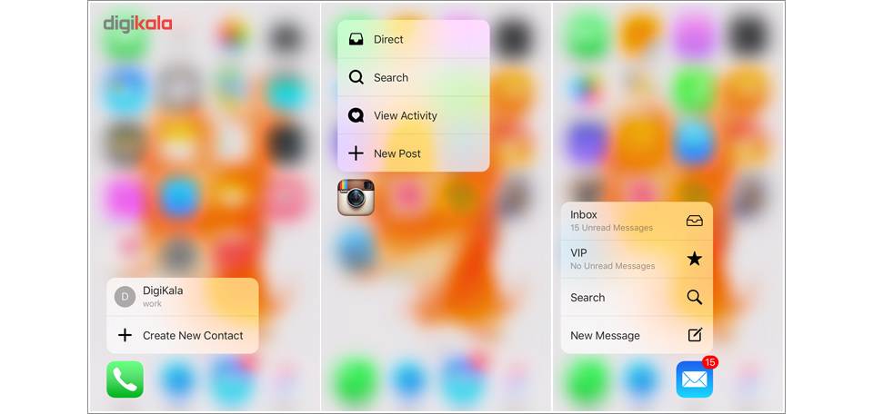 برای مثال با استفاده از فناوری لمس سهبعدی، میتوانید با فشارآوردن روی آیکون برنامههای مختلف به میانبرهای داخل برنامه دسترسی مستقیم داشته باشید. همچنین در گالری و برنامههای ایمیل یا پیام کوتاه هم میتوانید پیشنمایشی از تصاویر یا لینکها را قبل از بازکردن در برنامهی مخصوصشان ببینید. اپل از این فناوری برای خلاقیت بیشتر در بخش تصاویر پسزمینه هم کمک گرفته است. با انتخاب «تصاویر زنده» و با استفاده از فناوری لمس سهبعدی، میتوان این تصاویر را به حرکت درآورد. هر مقدار که فشار انگشتتان بیشتر باشد، این تصاویر با سرعت بیشتری به حرکت درمیآیند.
