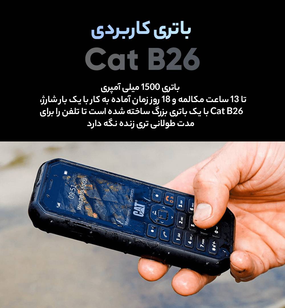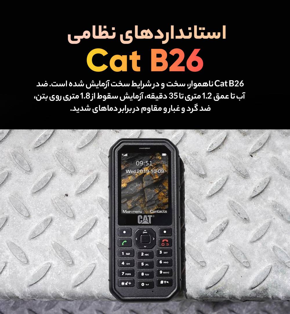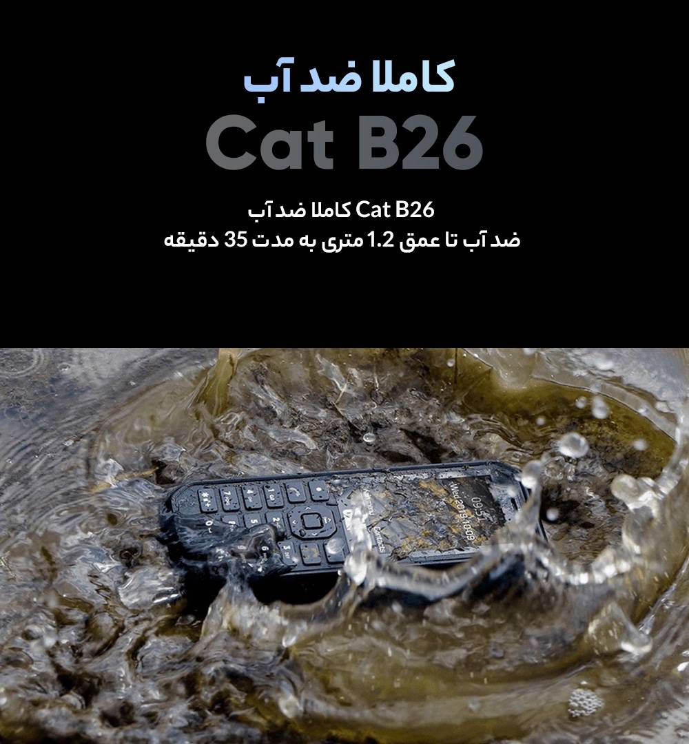 کاترپیلار در زمینه تولید گوشیهای مقاوم در برابر ضربه تا به امروز توانسته است عملکرد بسیار خوب و قابل قبولی را از خود بهنمایش بگذارد. یکی از گوشیهای باکیفیت این شرکت، مدل B26 است که با از طراحی کلاسیک بهره برده است. در نمای روبهرویی این گوشی به صفحهنمایش با ابعاد 2.4 اینچ با رزولوشن 240×320 پیکسل مجهز شده است. صفحهنمایشی که در هر اینچ توانایی نمایش 167 پیکسل را دارد. در قسمت پایینی صفحهنمایش هم صفحهکلید این گوشی را شاهد هستید که ابعاد مناسب دکمهها سبب شده تا استفاده راحت را با خود بههمراه داشته باشد. بدنه بسیار محکم این گوشی سبب شده تا در برابر ضربات و افتادنهای احتمالی بسیار مقاوم باشد. در قست پشتی هم تنها یک سنسور دوربین با رزولوشن 2 مگاپیکسل برای این گوشی در نظر گرفته شده است و باید بدانید که خبری از سنسور دوربین سلفی نیست. پشتیبانی از استاندارد ضدآب IP68 هم از دیگر قابلیتهای این گوشی است که سبب شده تا توانایی مقاومت قرارگیری در عمق 1.2 متر آب و مدت زمان 35 دقیقه را داشته باشد. حضور باتری با میزان ظرفیت 1500 میلیآمپرساعت هم سبب شده تا این گوشی، به ازای هر بار شارژ صد درصدی توانایی ارائه طول عمر مفید (زمان آماده بهکار) 13 ساعت برای مکالمه و 18 روز برای حالت استندبای را داشته باشد که عملکرد بسیار خوب و کاملا قابل قبولی است. گفتنیست که این گوشی پشتیبانی از زبان فارسی و عربی ندارد.