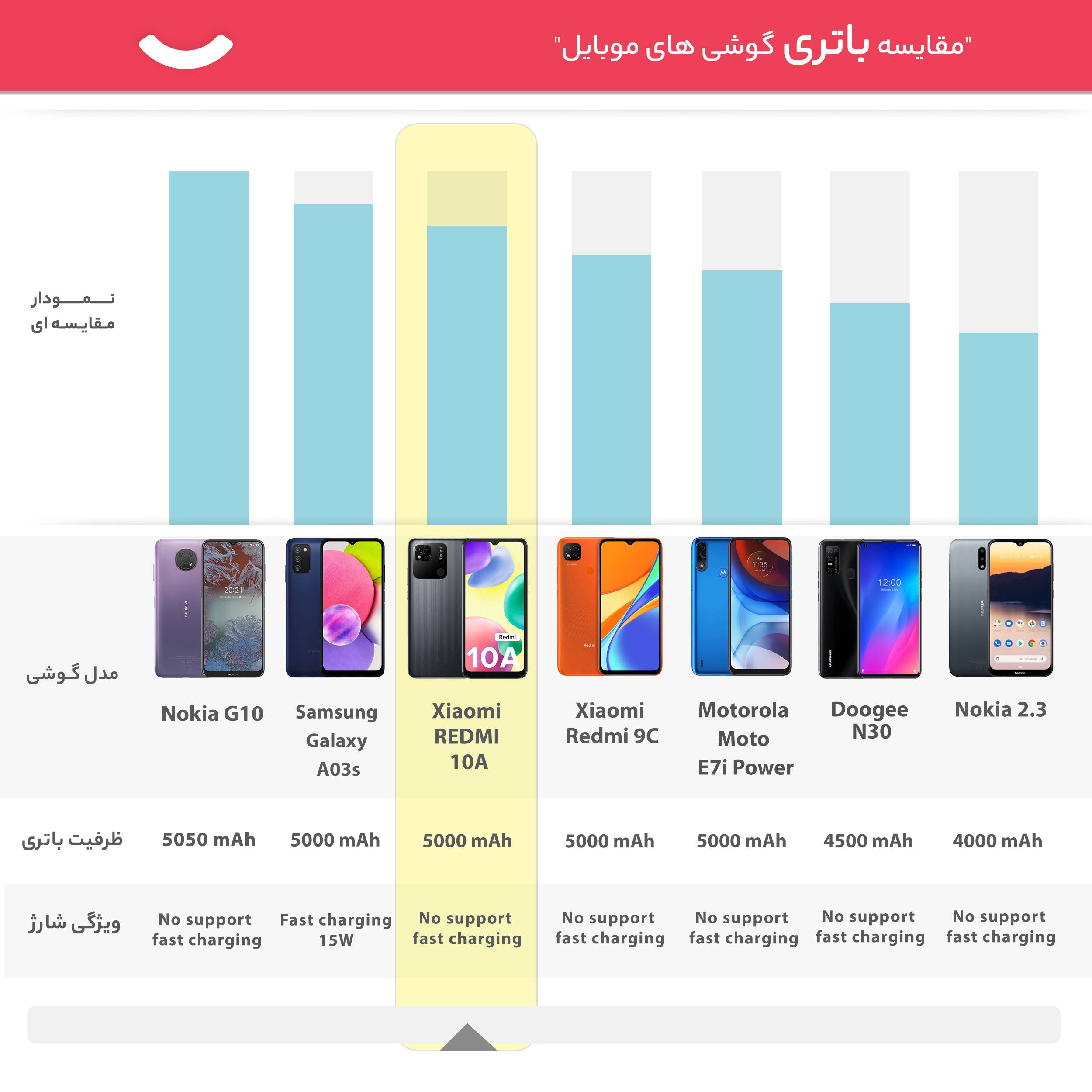 در بخش مشخصات سختافزاری هم شیائومی Redmi 10A به پردازنده میانرده هلیو G25 شرکت مدیاتک مجهز شده است. چهار هسته قدرتمندتر با توانایی ارائه حداکثر فرکانس کاری ۲.۰ گیگاهرتز در کنار چهار هسته اقتصادی با صرفه انرژی کمتر و توانایی ارائه حداکثر فرکانس کاری ۱.۵ گیگاهرتز، هشت هست این پردازنده با معماری ۱۲ نانومتری را تشکیل میدهند. با این تفاسیر باید بگوییم که این گوشی میانرده توانایی ارائه عملکرد قابل قبولی را در اجرای بازی و نرمافزارهای محبوب و پرکاربرد دارد. برای بازیهای سنگین و با گرافیک بالایی مثل کالآفدیوتی موبایل و آسفالت ۹ هم در صورتی که تنظیمات بازی را روی حالت LOW قرار دهید، عملکرد بهنسبت قابل قبولی را شاهد خواهید بود. اما باتری با میزان ظرفیت ۵۰۰۰ میلیآمپرساعت انتخاب بسیار خوبی برای این گوشی بود. باتری که به ازای هر بار شارژ صد درصدی، توانایی ارائه طول عمر مفید (زمان آماده بهکار) نزدیک به دو روز را در شرایط استفاده معمولی دارد. در مجموع باید بگوییم که اگر به دنبال خرید گوشی میانرده با قیمتی بهنسبت ارزان هستید که توانایی ارائه عملکرد خوبی در اجرای نرمافزارهای کاربردی داشته باشد و البته اگر سنسور دوربین فوق عریض برایتان چندان مهم نیست، شیائومی Redmi 10A میتواند با قیمتی مقرون بهصرفه، انتخاب بسیار مناسبی باشد.