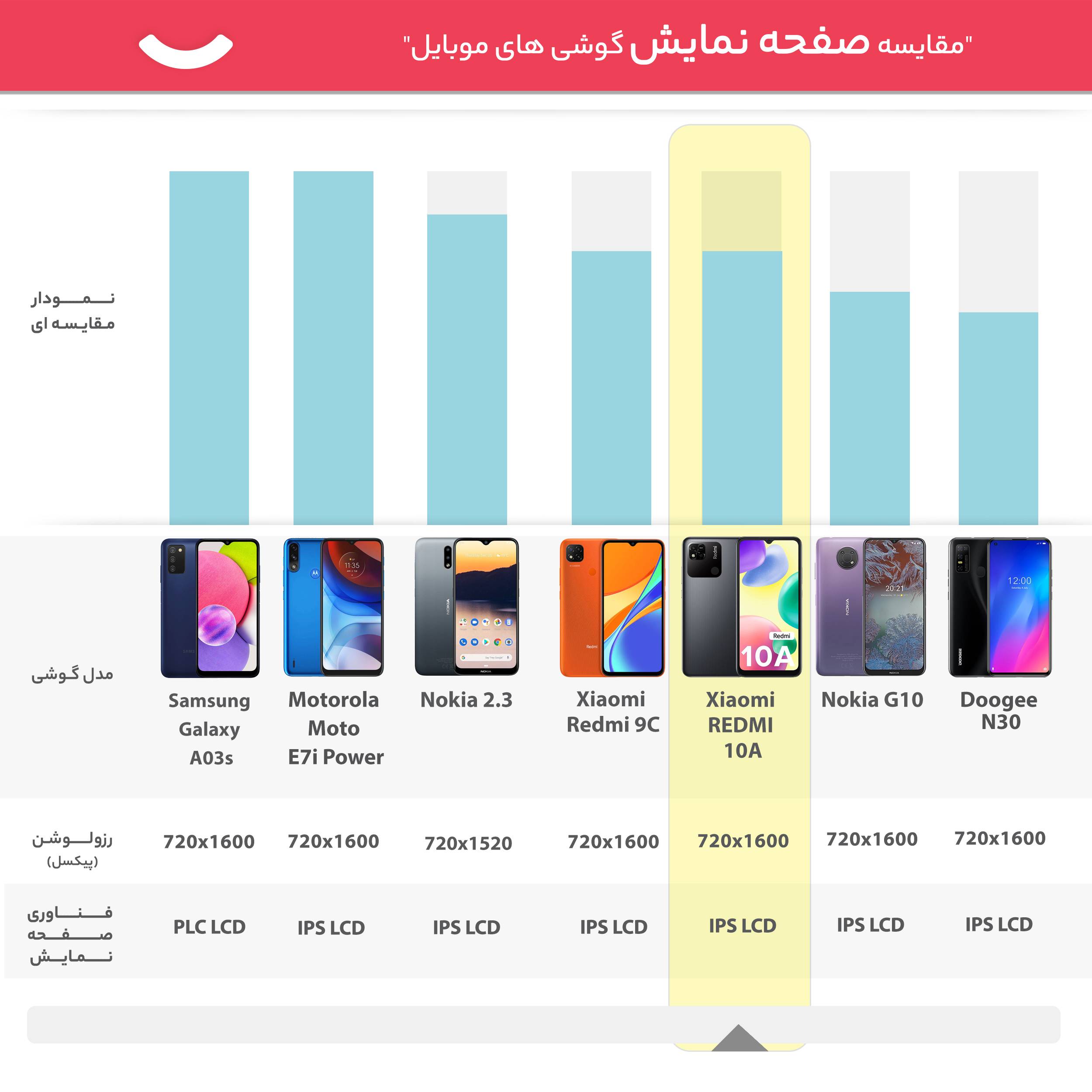 شیائومی Redmi 10A به صفحهنمایش با ابعاد ۶.۵۳ اینچ و رزولوشن ۷۲۰×۱۶۰۰ پیکسل از نوع IPS مجهز شده است. این صفحهنمایش توانایی نمایش ۲۶۹ پیکسل را در هر اینچ دارد. با توجه به مشخصاتی که به آنها اشاره کردیم، باید بگوییم که با توجه به قیمت در نظر گرفته شده، شیائومی Redmi 10A به صفحهنمایش مناسب و قابل قبولی مجهز شده است. در بهترین حالت ممکن این صفحهنمایش توانایی ارائه حداکثر روشنایی ۴۰۰ نیت (شمع در متر مربع) را دارد. چنین میزان روشنایی نشان از آن دارد که این صفحهنمایش در شرایط نوری متنوع توانایی ارائه وضوح تصویر مناسبی را دارد اما باید بگوییم که برای مثال زیر تابش مستقیم نور خورشید نباید توقع وضوح تصویر بسیار بالایی را داشته باشید.