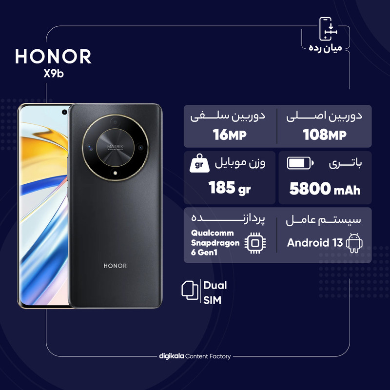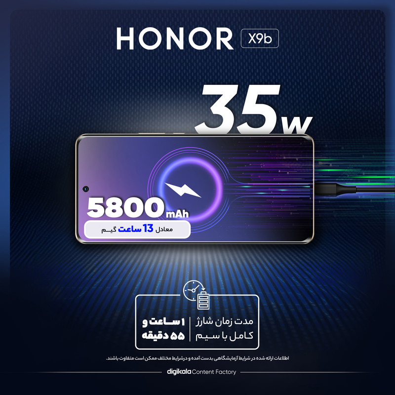 گوشی Honor X9B در سال 2023 روانه بازار شد و به عنوان یکی از بهترین و مقاومترین گوشیهای میانرده توانست به فروش خوبی دست پیدا کند. این گوشی از پردازنده کم مصرف Snapdragon 6 gen 1 استفاده میکند که یکی از بهترین پردازندهها در بازار گوشیهای میانرده به حساب میآید. این پردازنده به میتواند بازیها و برنامهها را بدون مشکل و به صورت روان اجرا کند. با این حال نباید از چنین پردازنده میانردهای انتظار اجرای بازیهای خیلی سنگین را داشت. این پردازنده همچنین از فناوری 5G پشتیبانی میکند که میتواند سرعت اینترنت را به حداکثر برساند. همانطور که اشاره کردیم، این پردازنده بسیار کم مصرف است و ترکیب این پردازنده با باتری 5800 میلی آمپری باعث شده تا این گوشی از نظر شارژدهی عملکرد بسیار چشمگیری داشته باشد. برای شارژ کردن این باتری هم یک شارژر سریع درون جعبه قرار گرفته که با استفاده از آن میتوان این باتری حجیم را شارژ کرد. دوربین اصلی این گوشی هم یکی از نقاط قوت آن محسوب میشود. Honor X9B از یک دوربین 109 مگاپیکسلی استفاده میکند که میتواند عکسها و ویدئوهایی با کیفیت بالا و جزئیات زیاد ثبت کند. همچنین دارای حالتهای مختلفی مانند عکاسی شب، پرتره، ماکرو و زوم است که امکانات گستردهای برای عکاسی فراهم میکند. به طور کلی Honor X9B یک گوشی میانرده با ویژگیهای فنی برجستهای است که میتواند رقبای خودش را به چالش بکشد. این گوشی با صفحه نمایش مقاوم و باکیفیت، دوربین قوی،عملکرد روان و باتری خوب، تجربه کاربری لذتبخشی را ارائه میدهد.