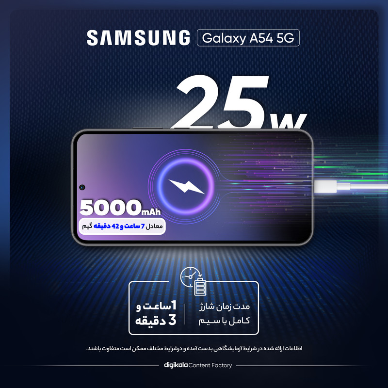 با هر سلیقه و توقعی از گوشیهای هوشمند میانرده، باید بدانید که گوشیهای میانرده سری A شرکت سامسونگ، میتوانند نیاز شما را برآورده کنند. سامسونگ Galaxy A54 5G هم با توجه به مشخصات فنی در نظر گرفته شده و البته قیمتی مقرون بهصرفه، ارزش خرید بالایی دارد. صفحهنمایش باکیفیت 6.4 اینچی این گوشی با رزولوشن بسیار خوب و حداکثر روشنایی 1000 نیت، در شرایط نوری متنوع و حتی زیر تابش مشتقیم نور خورشید هم، وضوح تصویر بسیار خوبی را ارائه میکند. حضور سنسور قدرتمند عریض (اصلی) برای ثبت تصاویر بسیار جذاب در نور روز و نور شب، سنسور دوربین فوق عریض 12 مگاپیکسل با زاویه دید گسترده 123 درجه که مناسب عکاسی در طبیعت است و همچنین سنسور 5 مگاپیکسل ماکرو برای ثبت تصاویر از فاصله نزدیک، بهخوبی تمام نیازهای شما را در عکاسی و حتی فیلمبرداری، فراتر از یک گوشی میانرده برآورده میکنند. پردازنده اگزینوس 1380 این گوشی هم سوالی عملکرد بسیار خوب در اجرای بازیهای حتی سنگین، سبب شده تا این گوشی توانایی پشتیبانی از شبکههای اینترنتی پرسرعت 5G را هم داشته باشد. در نهایت باتری 5000 میلیآمپرساعت هم به ازای هر بار شارژ صد درصدی، در شرایط استفاده معمولی، طول عمر مفید (زمان آماده بهکار) دو روز را ارائه میکند. همانطور که میدانید، درون جعبه این گوشی خبری از آداپتور شارژر نیست، اما این گوشی بههمراه شارژر 25 وات سامسونگ به فروش میرسد.