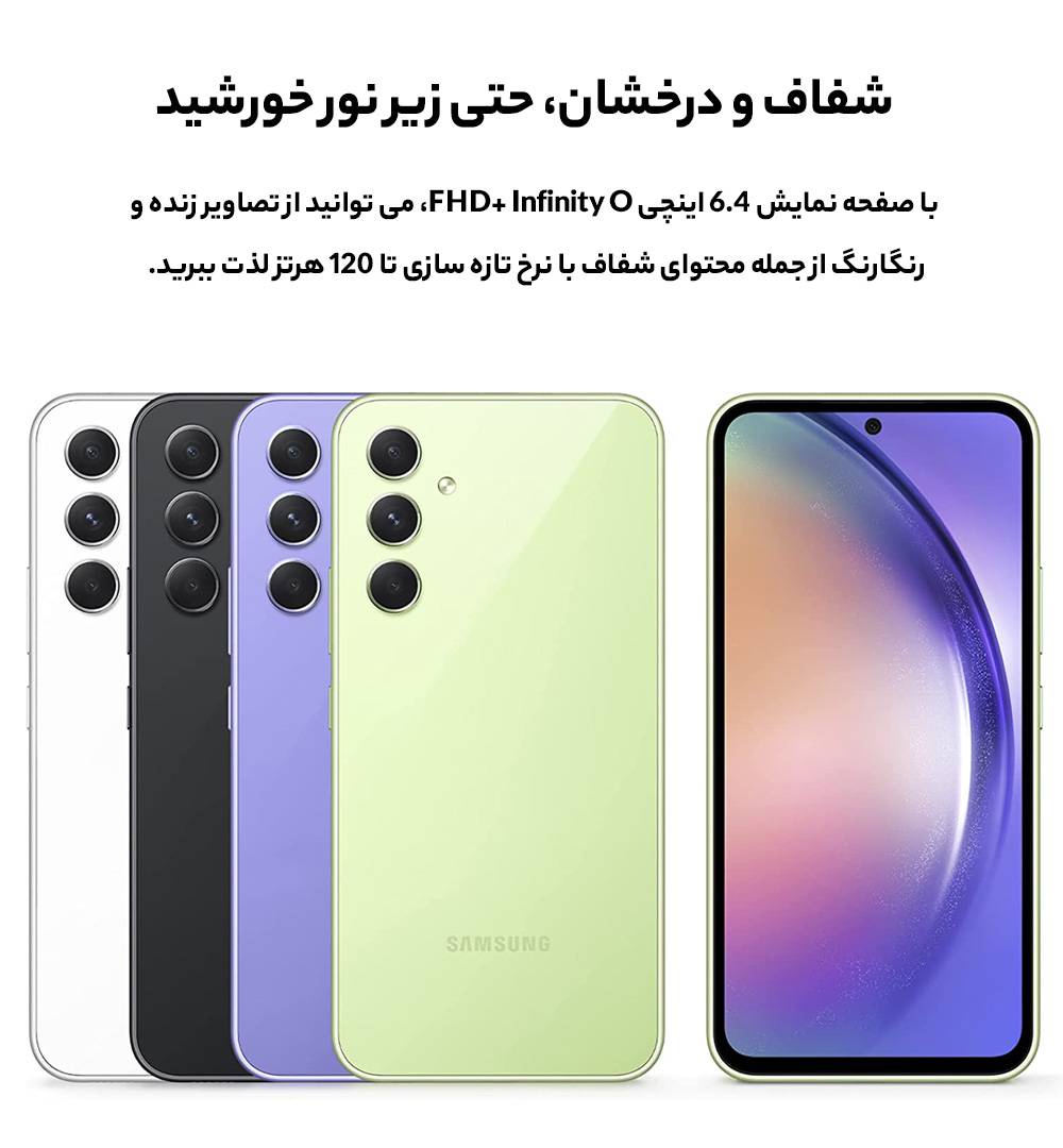 سامسونگ Galaxy A54 5G همانند اکثر گوشیهای هوشمند سامسونگ از صفحهنمایش باکیفیت و قدرتمندی بهره برده است. صفحهنمایش 6.4 اینچی این گوشی با رزولوشن بسیار خوب و البته توانایی نمایش میزان 403 پیکسل در هر اینچ، وضوح تصویر بسیار خوب، تفکیک رنگ جذاب و البته رنگهای زندهای را ارائه میکند. باید قبول کنیم که تا همینجا به یکی از قدرتمندترین صفحاتنمایش در بین گوشیهای میانرده روبهرو هستیم. اما باید بدانید که قابلیتهای قدرتمند این صفحهنمایش هنوز تمام نشده است.