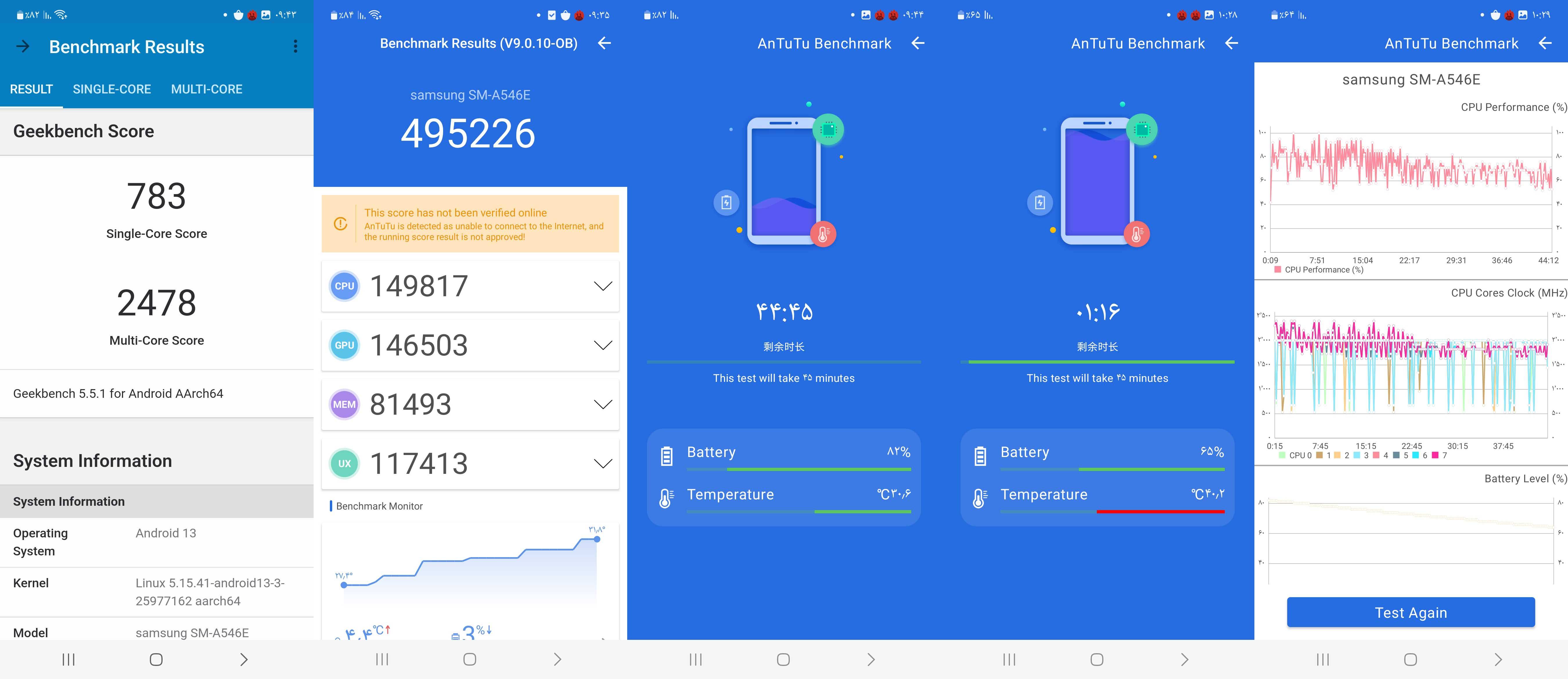 اما ایرادی که در این بخش به سامسونگ Galaxy A45 5G وارد است، کنترل نهچندان خوب دما در حالت ترافیک کاری بالاست. در تستهای انجام شده با توجه به تصاویر پایین، مشاهده میکنید که دما تا 40 درجه سانتیگراد هم بالا رفت و همین امر سبب شده تا عملکرد پردازنده برای کنترل دما کاهش پیدا کند. بهتر بود سامسونگ از خنککننده بهتری برای این گوشی استفاده میکرد. البته برای یک گوشی میانرده عملکرد بسیار خوبی است و به هیچ عنوان در اجرای بازی و برنامههای کاربردی به مشکل بر نخواهید خورد. باتری 5000 میلیآمپرساعت هم به ازای هر بار شارژ صد درصدی در حالت استفاده معمولی، زمان آماده بهکار دو روز را ارائه میکند. در مجموع باید بگوییم که اگر به دنبال خرید گوشی هوشمند میانردهای هستید که به طراحی جذاب، صفحهنمایشی باکیفیت، دوربینهای قدرتمند و مشخصات سختافزاری قابل قبولی مجهز شده باشد، شک نکنید که سامسونگ گلکسی A54 5G یکی از بهترین انتخابهای ممکن در بین گوشیهای این بازه قیمتی است.