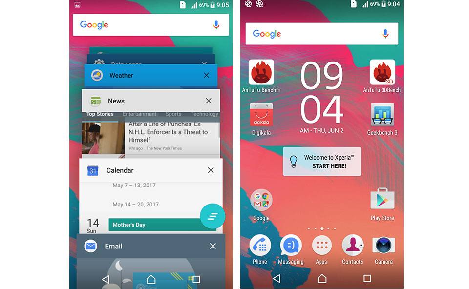 بدون معطلی به سراغ جذابترین بخش گوشی اکسپریا XA میرویم. اکسپریا XA از معدود گوشیهایی است که هیچ حاشیهای در سمت راست و چپ نمایشگر آن وجود ندارد. این ویژگی در کنار نمایشگر خمیده (2.5D) سبب شده این گوشی عرض کمی داشته باشد و بسیار خوشدست باشد. XA عرض کمی دارد؛ اما از سوی دیگر کمی کشیده و طویل به نظر میرسد. این موضوع سبب شده لمس قسمتهای بالایی نمایشگر با کمی سختی صورت بگیرد. در نگاه نخست، ظاهر اکسپریا XA ما را یاد دو گوشی قدیمی سونی یعنی اکسپریا Z3 و M5 میاندازد. XA درست مانند این دو گوشی، بدنهای کشیده و لبههایی خمیده دارد و حاشیهی قابلتوجهی در بالا و پایین نمایشگر آن مشاهده میشود. همچنین دکمهی پاور XA هیچ شباهتی به نسل جدید کلیدهای پاور این شرکت ندارد و همچون گوشیهای قبلیاش، طراحی دایرهای دارد. البته این موضوع را باید بهخاطر نبود حسگر اثرانگشت در اکسپریا XA دانست.