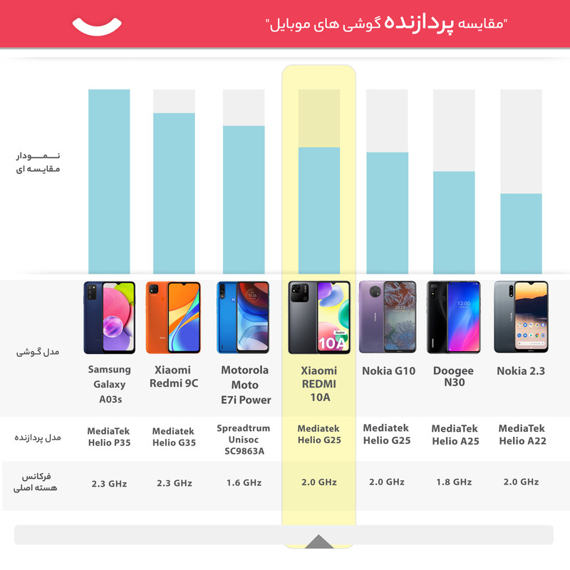 در بخش مشخصات سختافزاری هم شیائومی Redmi 10A به پردازنده میانرده هلیو G25 شرکت مدیاتک مجهز شده است. چهار هسته قدرتمندتر با توانایی ارائه حداکثر فرکانس کاری ۲.۰ گیگاهرتز در کنار چهار هسته اقتصادی با صرفه انرژی کمتر و توانایی ارائه حداکثر فرکانس کاری ۱.۵ گیگاهرتز، هشت هست این پردازنده با معماری ۱۲ نانومتری را تشکیل میدهند. با این تفاسیر باید بگوییم که این گوشی میانرده توانایی ارائه عملکرد قابل قبولی را در اجرای بازی و نرمافزارهای محبوب و پرکاربرد دارد. برای بازیهای سنگین و با گرافیک بالایی مثل کالآفدیوتی موبایل و آسفالت ۹ هم در صورتی که تنظیمات بازی را روی حالت LOW قرار دهید، عملکرد بهنسبت قابل قبولی را شاهد خواهید بود. اما باتری با میزان ظرفیت ۵۰۰۰ میلیآمپرساعت انتخاب بسیار خوبی برای این گوشی بود. باتری که به ازای هر بار شارژ صد درصدی، توانایی ارائه طول عمر مفید (زمان آماده بهکار) نزدیک به دو روز را در شرایط استفاده معمولی دارد. در مجموع باید بگوییم که اگر به دنبال خرید گوشی میانرده با قیمتی بهنسبت ارزان هستید که توانایی ارائه عملکرد خوبی در اجرای نرمافزارهای کاربردی داشته باشد و البته اگر سنسور دوربین فوق عریض برایتان چندان مهم نیست، شیائومی Redmi 10A میتواند با قیمتی مقرون بهصرفه، انتخاب بسیار مناسبی باشد.