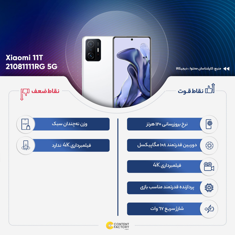 شرکت شیائومی در چند سال اخیر عملکرد بسیار درخشانی در زمینه گوشیهای هوشمند بهنمایش گذاشته است و عملکرد بسیار خوب این شرکت سبب شد تا کاربران زیادی را به سمت خود جلب کند. شیائومی 11T یکی از گوشیهای هوشمند بسیار باکیفیت این شرکت است که به مشخصات فنی قدرتمندی مجهز شده است. در همان نگاه اول طراحی در نظر گرفته شده برای این گوشی نشان از آن دارد که با گوشی هوشمند قدرتمند و بسیار باکیفیتی روبهرو هستیم. شیائومی 11T به صفحهنمایش 6.67 اینچ با رزولوشن 1080×2400 پیکسل از نوع امولد مجهز شده است. صفحهنمایشی که توانایی نمایش 395 پیکسل در هر اینچ را دارد. توانایی ارائه نرخ بروزرسانی 120 هرتز نشان از آن دارد که با صفحهنمایش همه چیز تمامی روبهرو هستیم. در قسمت پشتی هم سه سنسور دوربین برای این گوشی در نظر گرفته شده است. یک سنسور دوربین اصلی قدرتمند با رزولوشن 108 مگاپیکسل از نوع عریض با گشودگی دریچه دیافراگم f/1.8 در کنار سنسور 8 مگاپیکسل از نوع فوق عریض (ultra wide) و سنسور 5 مگاپیکسل از نوع تله فوتو ماکرو، سنسورهای دوربین سهگانه این گوشی هوشمند را تشکیل میدهند. برای دوربین سلفی هم سنسور با رزولوشن 16 مگاپیکسل در نظر گرفته شده است. سنسور دوربین اصلی 108 مگاپیکسل توانایی ضبط ویدیو با حداکثر کیفیت 4K و سرعت 30 فریم در ثانیه و سنسور دوربین سلفی هم توانایی ضبط ویدیو با حداکثر کیفیت 1080p و سرعت 30 فریم در ثانیه را دارند. در بخش مشخصات سختافزاری هم شیائومی 11T به یکی از قدرتمندترین پردازندههای شرکت مدیاتک یعنی دیمنسیتی 1200 5G مجهز شده است. بهره بردن از چنین پردازندهای سبب شده تا با خیال راحت حتی سنگینترین بازیهای روز را هم اجرا کنید و عملکرد بسیار خوب و قابل قبولی را از این گوشی هوشمند شاهد باشید. این پردازنده توانایی پشتیبانی از شبکههای اینترنتی نسل پنجم یا همان 5G را هم دارد. شیائومی 11T به باتری با میزان ظرفیت 5000 میلیآمپرساعت مجهز شده است. حضور شارژر قدرتمند با توان 67 وات و پشتیبانی از فناوری شارژ سریع سبب شده تا در مدت زمان کوتاه 36 دقیقه، شارژ 0 تا 100 درصدی باتری این گوشی هوشمند انجام شود.