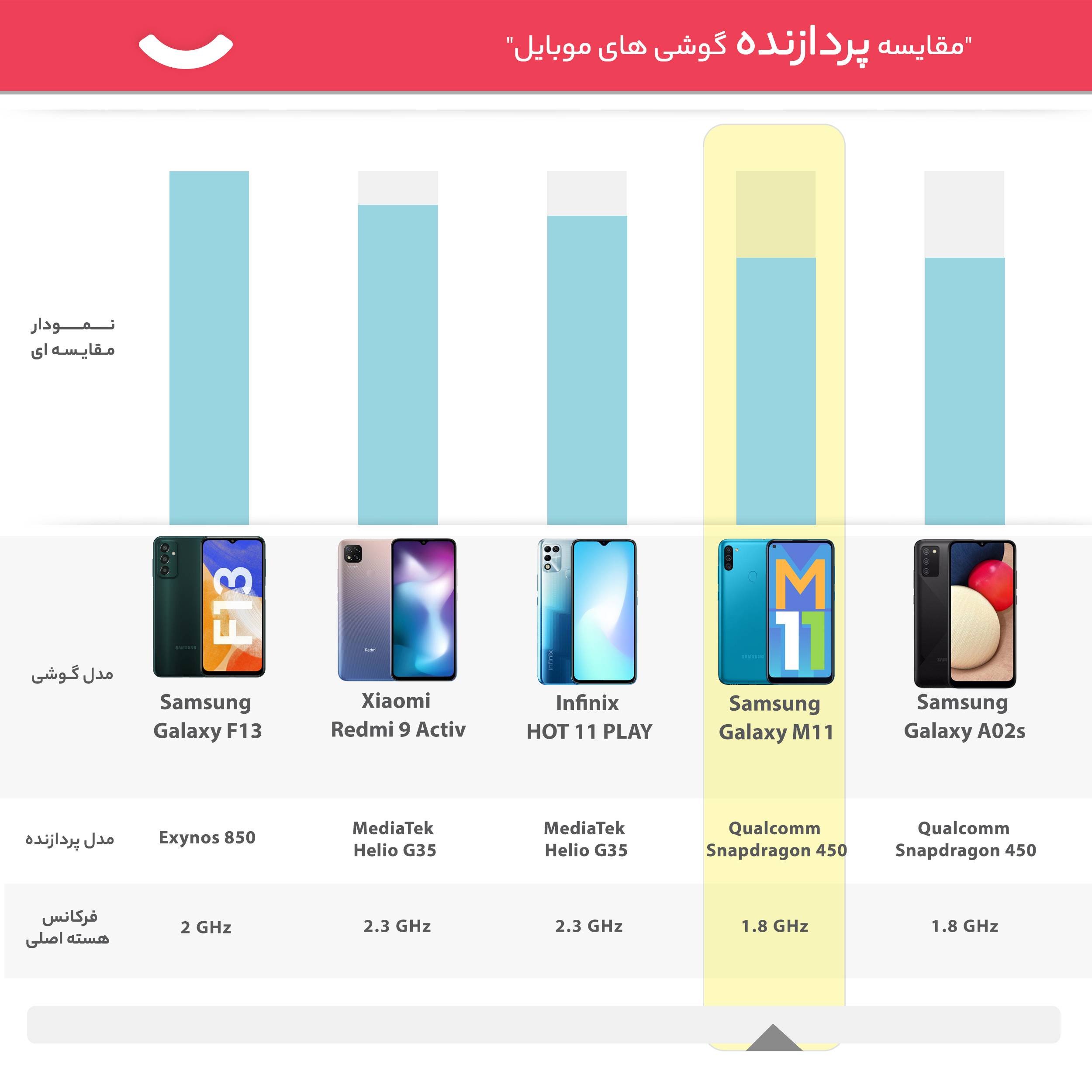 سامسونگ گلکسی M11 به پردازنده میانرده اسنپدراگون 450 شرکت کوالکام مجهز شده است. پردازندهای با معماری 14 نانومتری که هستههای در نظر گرفته شده توانایی ارائه حداکثر فرکانس کاری 1.8 گیگاهرتز را دارند. میزان فرکانس هستهها و پردازنده گرافیکی Adreno 506 سبب شده تا این گوشی هوشمند توانایی اجرای بازیهای نه چندان سنگین را بهخوبی داشته باشد اما برای بازیهای سنگینی همچون آسفالت 9 نباید چندان روی این گوشی میانرده حساب باز کرد. در زمینه ظرفیت باتری در نظر گرفته شده هم این گوشی هوشمند همانند اکثر گوشیهای میانرده سری A و M به باتری قدرتمندی با میزان ظرفیت 5000 میلیآمپرساعت مجهز شده است. درست است که پردازنده 14 نانومتری این گوشی به نسبت پردازندههای 10 و 8 نانومتری مصرف انرژی بیشتری دارد، اما سامسونگ بهخوبی با استفاده از باتری قدرتمند، این ضعف را پوشش داده تا گلکسی M11 بتواند به ازای هر بار شارژ 100 درصدی طول عمر مفید (زمان آماده بهکار) مناسب و کاملا قابل قبولی را ارائه کند.