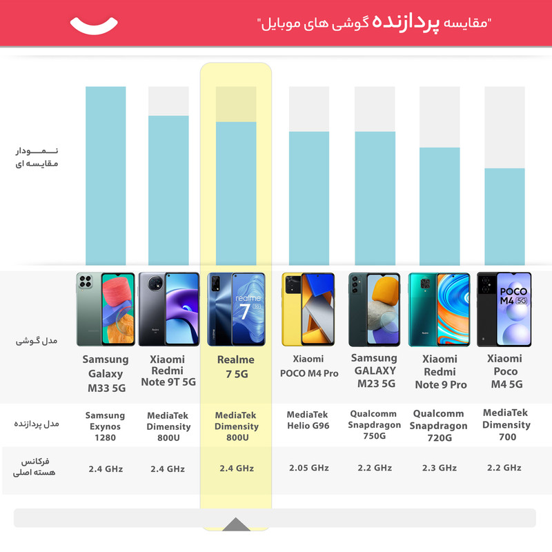 در بخش مشخصات سختافزاری هم، ریلمی 7 5G در جایگاه یک گوشی میانرده، از مشخصات فنی بسیار خوب و قابل قبولی بهره برده است. دیمنسیتی 800U به عنوان یکی از قدرتمندترین پردازندههای میانرده شرکت مدیاتک، این گوشی هوشمند را همراه میکند. دو هسته قدرتمندتر با توانایی ارائه حداکثر فرکانس کاری ۲.۴ گیگاهرتز در کنار شش هسته اقتصادی با صرفه انرژی کمتر و توانایی ارائه فرکانس کاری ۲.۰ گیگاهرتز، هشت هسته این پردازنده را تشکیل میدهند. با این تفاسیر باید بگوییم که ریلمی 7 5G بهخوبی از پس بازیهای حتی سنگین مثل کالآفدیوتی موبایل و آسفالت ۹ برمیآید و البته پیشنهاد ما به شما در اجرای چنین بازیهای سنگینی این است که تنظیمات گرافیکی بازی را روی حالت high performance قرار ندهید تا عملکرد بهتر و بدون لگ را شاهد باشید.