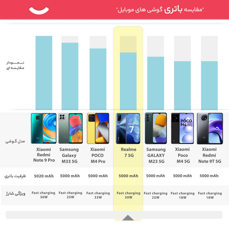 | مشخصات باتری | باتری لیتیوم پلیمری با ظرفیت 5000 میلیآمپر ساعت قابلیت شارژ سریع با توان 30 وات (50 درصد در 26 دقیقه و 100 درصد در 65 دقیقه) |