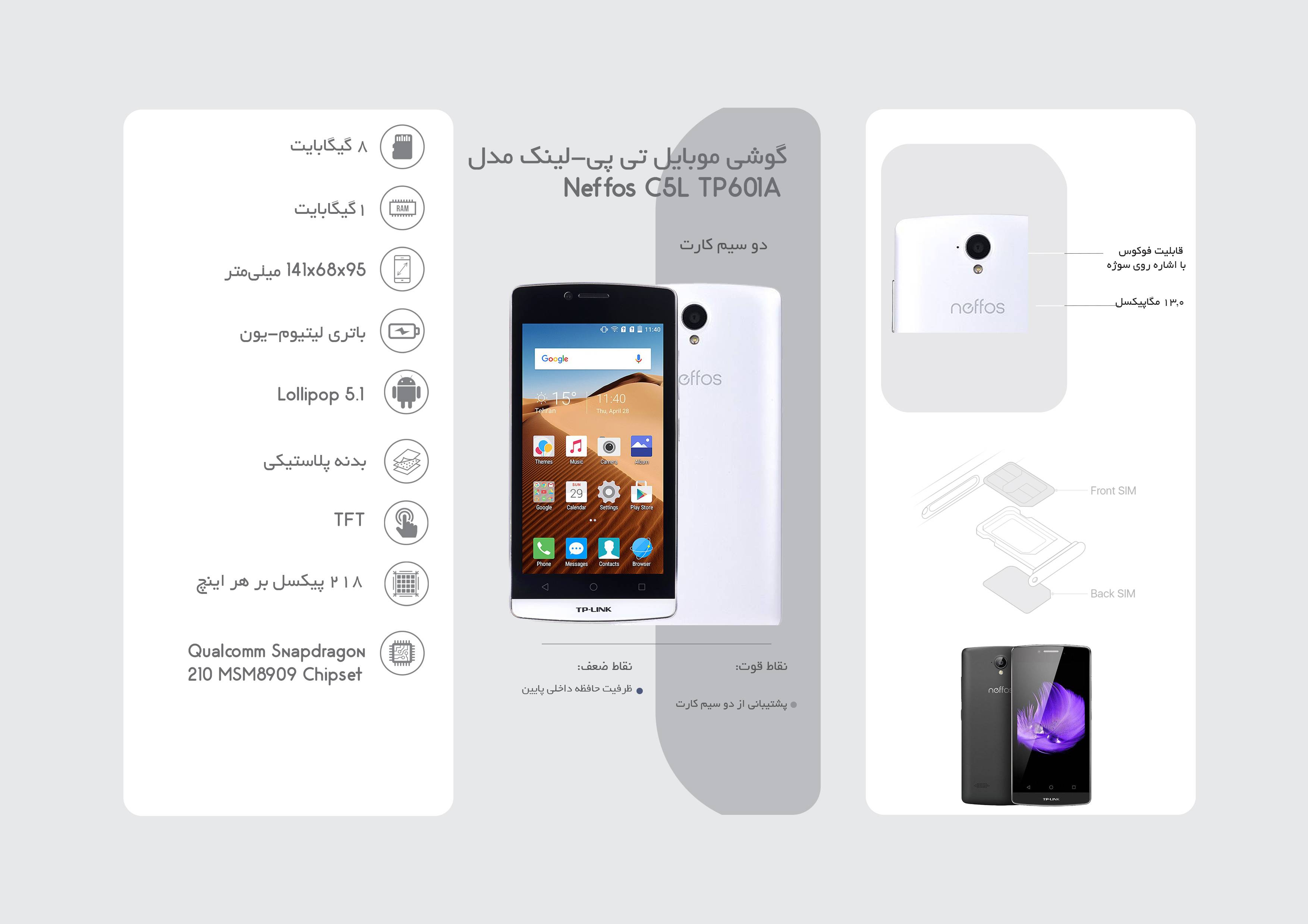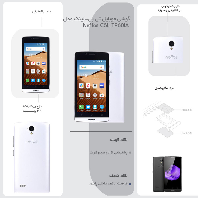 برند معروف و چینی «تیپی-لینک» (TP-LINK) که در تولید لوازم ارتباطی تبحر خاصی دارد، پا را کمی فراتر گذاشته و با معرفی برند «نفوس» (Neffos) میخواهد خود را به دنیای گوشیهای همراه هم وارد کند. این شرکت با تولید سه گوشی با اندازه و مشخصات مختلف میخواهد سهمی در بازار گوشیهای همراه داشته باشد. گوشی «تیپی-لینک نفوس C5L دو سیمکارت» (TP-LINK Neffos C5L TP601A Dual SIM) کوچکترین گوشی در بین سه گوشی است. این گوشی با نمایشگری با اندازهی مناسب، دوربینهایی برای ثبت تصاویری که برای شبکههای اجتماعی مناسب هستند، سختافزاری مطلوب برای انجام امور روزانه، پشتیبانی از دو سیمکارت و شبکهی 4G را در کنار قیمتی مناسب عرضه میکند. همچنین مجهز شدن گوشی به سیستمعامل بهروز میتوانند در خرید این گوشی موثر باشد. نمایشگری 4.5 اینچی با فناوری TFT و از نوع LCD برای این گوشی در نظر گرفته شده است. این نمایشگر تراکم 218 پیکسل بر اینچ را به تصویر میکشد و میتواند تا 2 لمس را بهطور هم زمان پاسخگو باشد. این نمایشگر با روشنایی مطلوب، تراکم کافی و اندازهی مناسب برای وبگردی و بازی مفید است. انتخاب مجموعهی سختافزاری نهچندان قدرتمند برای این گوشی باعث شده تا فقط بتواند برای انجام امور روزانه مناسب باشد. پردازندهی مرکزی چهار هستهای همراه با یک گیگابایت رم و هشت گیگابایت حافظه داخلی مجموعهی سختافزاری تیپی-لینک C5L را تشکیل میدهند. همچنین امکان استفاده از کارت حافظهی جانبی تا حجم 32 گیگابایت هم برای کاربران این گوشی فراهم شده است. از ویژگیهای ارتباطی در این گوشی هم میتوان به پشتیبانی از دو سیمکارت و اینترنت پرسرعت نسل چهارم، بلوتوث و Wi-Fi اشاره کرد. دو دوربین 8 و 2 مگاپیکسلی برای دوربینهای اصلی و سلفی نفوس C5L انتخاب شدهاند؛ این دوربینها میتوانند تصاویری مناسب را ثبت کنند. همچنین دوربین اصلی به فلشی از نوع LED مجهز شده است.