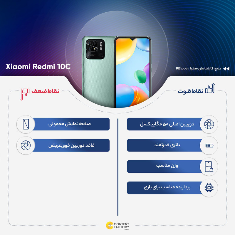 یکی از گوشیهای هوشمند میانرده و مقرون بهصرفه شرکت شیائومی، مدل Redmi 10C است که میتوان گفت در جایگاه یک گوشی میانرده به مشخصات فنی مناسب و قابل قبولی مجهز شده است. در نمای روبهرویی این گوشی از صفحهنمایش با ابعاد 6.71 اینچ و رزولوشن 720×1650 پیکسل از نوع IPS مجهز شده است. صفحهنمایشی که توانایی نمایش 268 پیکسل در هر اینچ را هم دارد. بریدگی قطرهای شکل ناچ واتردراپ در قسمت بالایی و مرکزی صفحهنمایش، سنسور دوربین سلفی با رزولوشن 5 مگاپیکسل را در خود جای داده است. سنسوری که توانایی ارائه عملکرد بسیار مناسبی را در برقراری تماسهای تصویری دارد و از طرفی برای عکاسی در روز هم میتوان گفت مناسب است. در قسمت پشتی اما تنها دو سنسور دوربین برای این گوشی میانرده در نظر گرفته شده است و خبری از سنسور دوربین محبوب فوق عریض یا همان ultrawide نیست. یک سنسور دوربین اصلی قدرتمند با رزولوشن 50 مگاپیگسل و گشودگی دریچه دیافراگم f/1.8 در کنار سنسور 2 مگاپیکسل از نوع سنجش عمق (depth)، سنسورهای دوربین دوگانه شیائومی Redmi 10C را تشکیل میدهند. این گوشی به پردازنده میانرده اسنپدراگون 680 4G شرکت کوالکام مجهز شده است و به همین دلیل در اجرای بازیها (حتی بازیهای سنگین مثل کالآفدیوتی موبایل و آسفالت 9) و نرمافزارهای کاربردی و محبوب، توانایی ارائه عملکرد کاملا قابل قبولی را دارد. باتری با میزان ظرفیت 5000 میلیآمپرساعت هم سبب شده تا به ازای هر بار شارژ صد درصدی، شاهد طول عمر مفید (زمان آماده بهکار) دو روز در شرایط استفاده معمولی باشید.