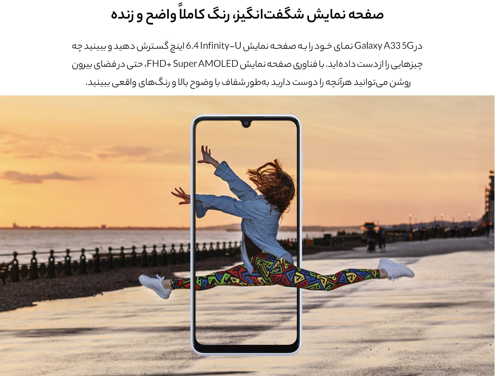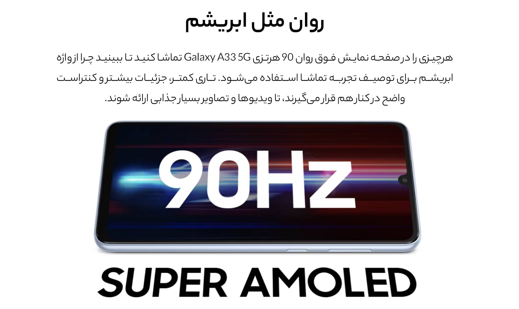 سامسونگ از پنل سوپرامولد برای صفحهنمایش این گوشی استفاده کرده است و باید بدانید که این پنل در کنار ارائه کیفیت بهتر بهنسبت پنلهای IPS، مصرف انرژی کمتری هم دارد که که در طول عمر مفید (زمان آماده بهکار) گوشی به ازای هر بار شارژ تاثیر بسیار زیادی دارد. برخلاف بسیاری از گوشیهای هوشمند که به صفحهنمایش با نرخ بروزرسانی ۶۰ هرتز مجهز شدهاند، صفحهنمایش Galaxy A33 5G توانایی ارائه حداکثر نرخ بروزرسانی ۹۰ هرتز را دارد که این نرخ بروزرسانی تاثیر مستقیمی در ارائه کیفیت بهتر در اجرای بازی و تماشای ویدیوهای باکیفیت به نسبت صفحاتنمایش با نرخ بروزرسانی ۶۰ هرتز دارد.
