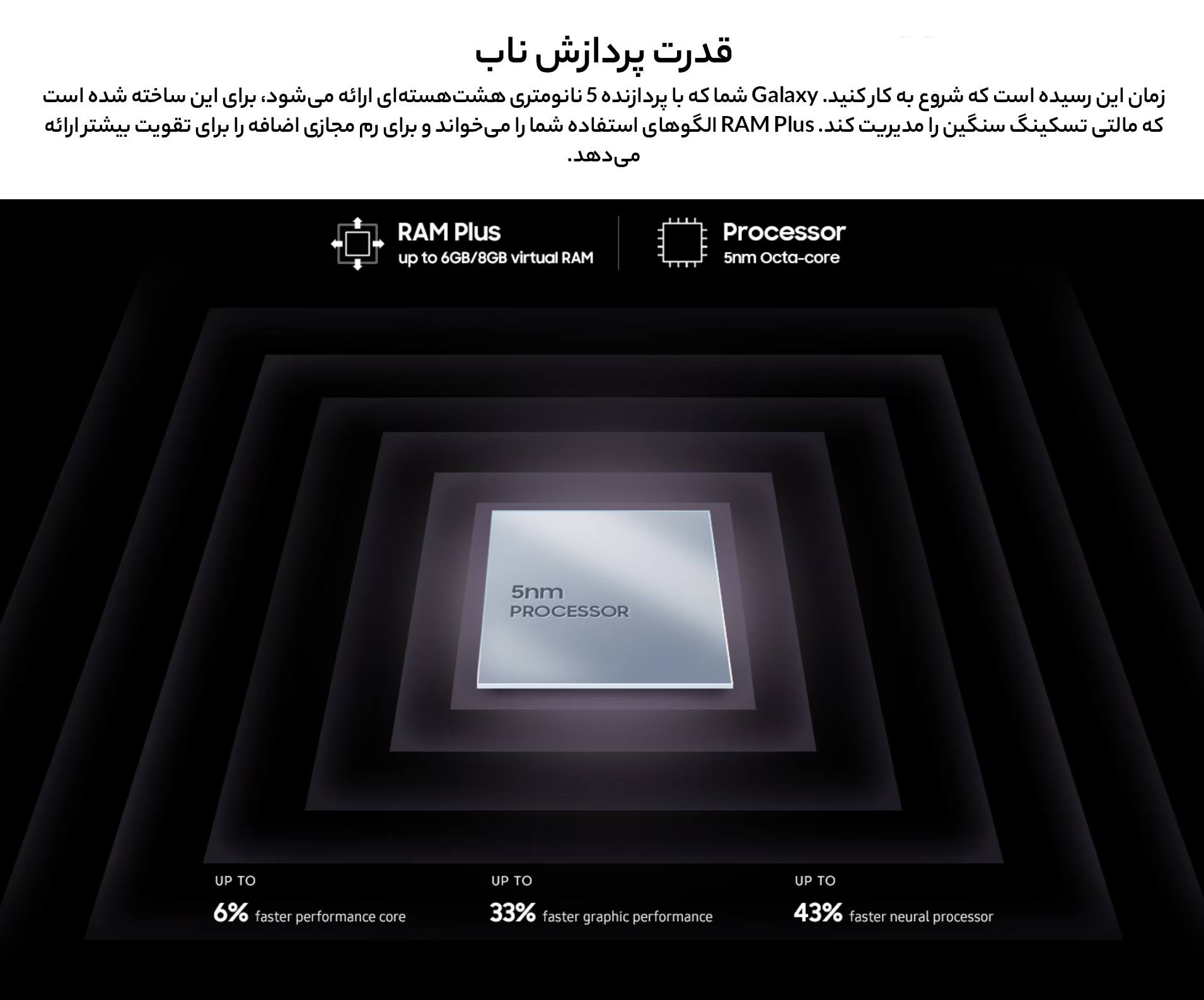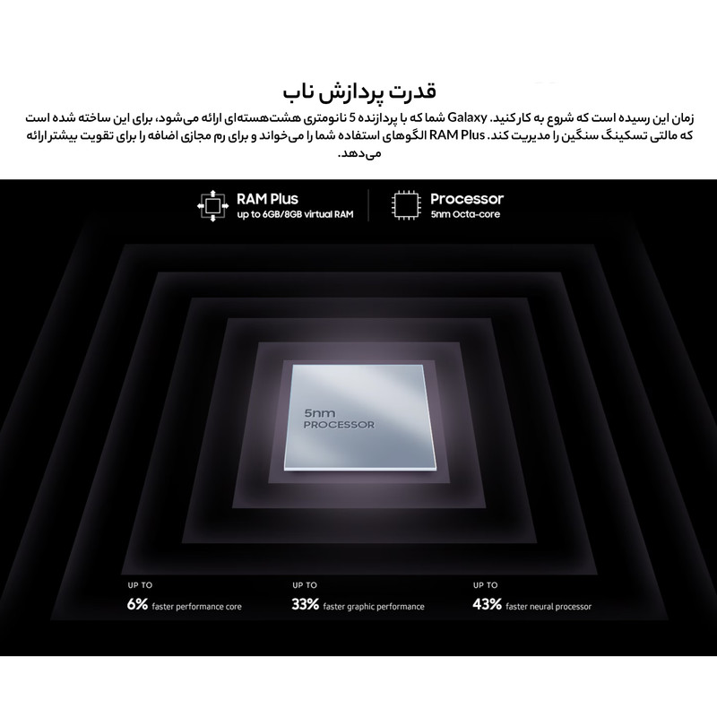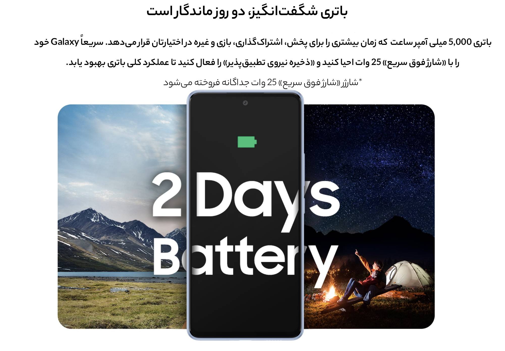 سامسونگ Galaxy A53 5G به پردازنده اگزینوس ۱۲۸۰ اختصاصی سامسونگ مجهز شده است. پردازندهای با معماری ۵ نانومتری که نهتنها عملکرد بسیار خوبی دارد و از شبکههای اینترنتی 5G پشتیبانی میکند، بلکه در مقایسه با پردازندههایی با معماری ۷ و ۸ نانومتری، مصرف انرژی کمتری دارد که این امر تاثیر مستقیم در طول عمر مفید (زمان آماده بهکار) باتری دارد. دو هسته قدرتمندتر با توانایی ارائه حداکثر فرکانس کاری ۲.۴ گیگاهرتز در کنار شش هسته اقتصادی با صرفه انرژی کمتر و توانایی ارائه فرکانس کاری ۲.۰ گیگاهرتز، هشت هشته آن را تشکیل میدهند. با توجه به مشخصات که از پردازنده این گوشی گفتیم، باید بدانید که سامسونگ Galaxy A53 5G بهخوبی از پس اجرای بازیهای سنگینی مثل کالآفدیوتی موبایل و آسفالت ۹ برمیآید و در کنار صفحهنمایش بسیار باکیفیت، تجربه گیمپلی بسیار لذت بخشی را با این گوشی میانرده خواهید داشت. باتری با میزان ظرفیت ۵۰۰۰ میلیآمپرساعت در نظر گرفته شده برای این گوشی هم به ازای هر بار شارژ صد درصدی توانایی ارائه طول عمر مفید دو روز در شرایط استفاده معمولی را دارد.