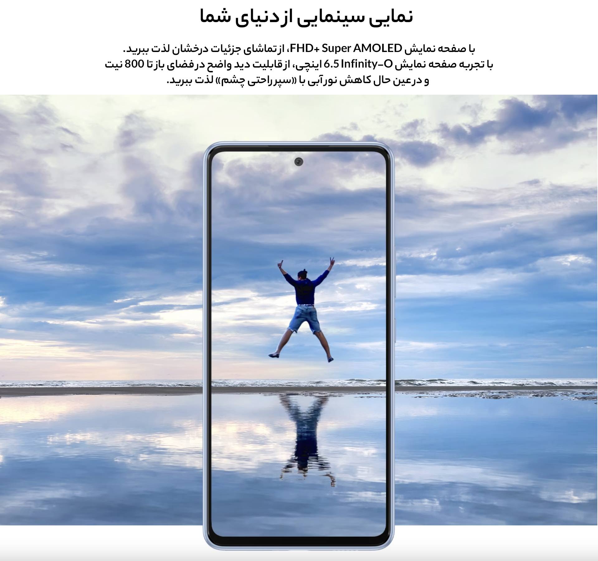 در بخش صفحهنمایش هم باید بگوییم که سامسونگ Galaxy A53 5G تمام توقعات شما را از یک صفحهنمایش قدرتمند برآورده میکند. صفحهنمایش با ابعاد ۶.۵ اینچ و رزولوشن ۱۰۸۰×۲۴۰۰ پیکسل از نوع سوپرامولد که توانایی نمایش ۴۰۵ پیکسل در هر اینچ را دارد. تا همینجا هم متوجه شدهاید که نهتنها در بین گوشیهای میانرده، بلکه در بین گوشیهای پرچمدار هم سامسونگ گلکسی Galaxy A53 5G حرفهای بسیاری برای گفتن دارد. اما جالبتر میشود وقتی متوجه شوید که این صفحهنمایش توانایی ارائه نرخ برزورسانی ۱۲۰ هرتز را دارد. چنین نرخ بروزرسانی بدون شک عملکرد بسیار خوب و باکیفیتی در اجرای بازیهای سنگین با گرافیک بالا و ویدیوهای باکیفیت دارد. این صفحهنمایش با حداکثر روشنایی ۸۰۰ نیت (شمع در متر مربع) وضوح تصویر کاملا قابل قبولی را در شرایط نوری متنوع ارائه میکند و حتی زیر تابش مستقیم نور خورشید هم وضوح بسیار خوبی را از این صفحهنمایش شاهد خواهید بود.
