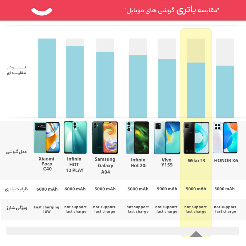ویکو برند تازه وارد به بازار گوشیهای هوشمند است که توانسته است با معرفی گوشیهای هوشمند میانرده، عملکرد خوب و قابل قبولی را بهنمایش بگذارند. ویکو T3 هم یکی از گوشیهای هوشمند میانرده و مقرون بهصرفه این شرکت است. طراحی در نظر گرفته شده برای این گوشی، طراحی آشنایی است که نمونه آن را در بسیاری از گوشیهای هوشمند میانرده دیگر هم شاهد بودیم. در نمای روبهرویی این گوشی به صفحهنمایش با ابعاد 6.6 اینچی با رزولوشن 720×1600 مجهز شده که طراحی ناچ واتردراپ برای این صفحهنمایش در نظر گرفته شده است. بریدگی قطرهای شکل ناچ در قسمت بالایی و مرکزی صفحهنمایش، سنسور دروبین سلفی با رزولوشن 8 مگاپیکسل را در خود جای داده است. در قسمت پشتی هم شاهد قرارگیری سه سنسور دوربین هستیم که یک سنسور دوربین اصلی با رزولوشن 48 مگاپیکسل از نوع عریض (wide) در کنار سنسور 5 مگاپیکسل از نوع فوقعریض (ultrawide) با زاویه دید 120 درجه و سنسور 2 مگاپیکسل از نوع سنجش عمق، سنسورهای دروبین سهگانه آن را تشکیل میدهند. حضور پردازنده میانرده هلیو P35 شرکت مدیاتک هم سبب شده تا ویکو T3 توانایی ارائه عملکرد مناسب و قابل قبولی را در اجرای بازیهای محبوب و نرمافزارهای کاربردی داشته باشد. ویکو T3 به باتری قدرتمند با میزان ظرفیت 5000 میلیآمپرساعت مجهز شده است که این باتری به ازای هر بار شارژ صد درصدی طول عمر مفید (زمان آماده بهکار) دو روز در شرایط استفاده معمولی، 172 ساعت پخش موسیقی و 28 ساعت تماشای ویدیو را ارائه میکند. این محصول ساخت کشور فرانسه است که توانسته در بخش گوشیهای هوشمند عملکرد خوبی را بهنمایش بگذارد.