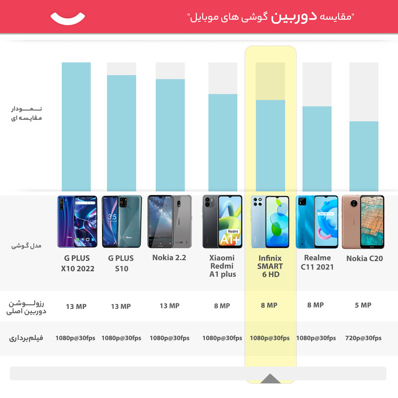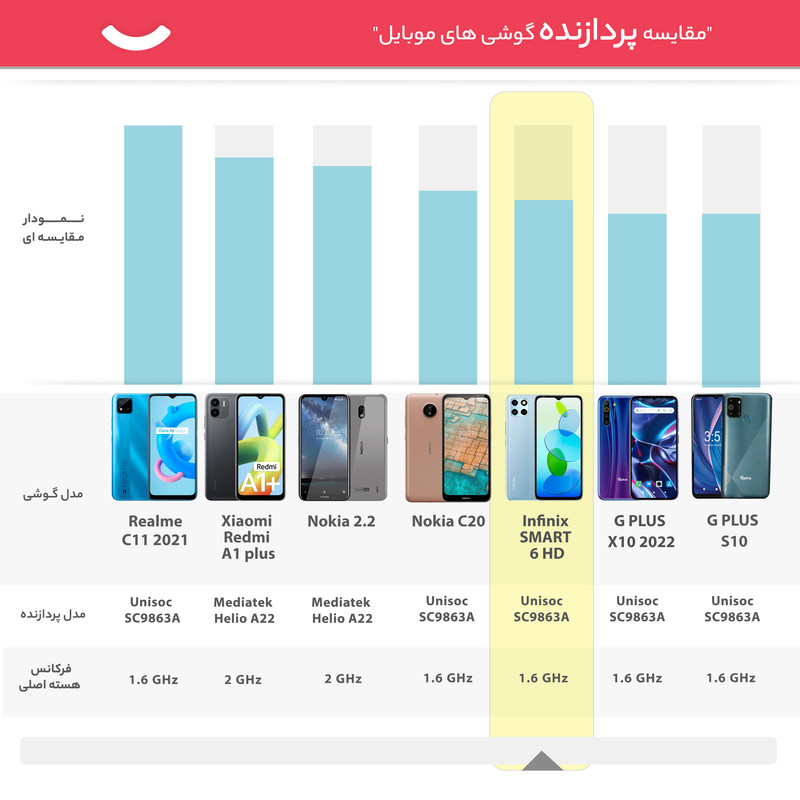 در بخش مشخصات سختافزاری هم پردازنده میانرده و نهچندان جدید Unisoc SC9863A با معماری ۲۸ نانومتری این گوشی هوشمند میانرده را همراهی میکند. چهار هسته قدرتمندتر با توانایی ارائه حداکثر فرکانس کاری ۱.۶ گیگاهرتز در کنار چهار هسته اقتصادی با صرفه انرژی کمتر و توانایی ارائه حداکثر فرکانس کاری ۱.۲ گیگاهرتز، هشت هسته این پردازنده را تشکیل میدهند. با این تفاسیر، اینفینیکس Smart 6 HD در اجرای بازیهای سبک و نرمافزارهای محبوب و کاربردی، عملکرد قابل قبولی دارد. اما برای اجرای بازیهای سنگین مثل کالآفدیوتی موبایل، چندان روی این گوشی حساب باز نکنید. اما در بخش باتری، اینفینیکس Smart 6 HD با بهره بردن از باتری ۵۰۰۰ میلیآمپرساعت، توانایی ارائه عملکرد قابل قبولی را دارد. باید بدانید که این باتری به ازای هر بار شارژ صد درصدی، توانایی ارائه طول عمر مفید (زمان آماده بهکار) یک روز و حتی کمی بیشتر را خواهد داشت. در مجموع باید بگوییم که اگر به دنبال خرید گوشی هوشمند میانردهای هستید که در کنار عملکرد قابل قبول در اجرای نرمافزارهای کاربردی، قیمت ارزانتری هم به نسبت بسیاری از گوشیهای میانرده موجود در بازار داشته باشد، اینفینیکس Smart 6 HD میتواند یکی از انتخابهای بسیار خوب برای شما باشد.