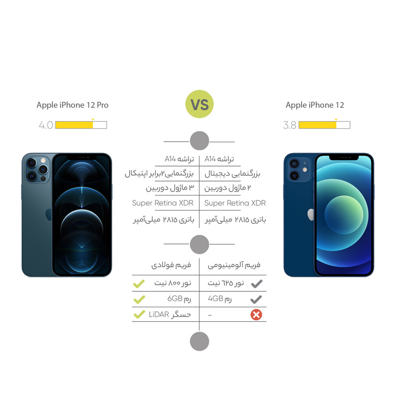 اگر به دنبال آیفونی سبک و جمعوجورتری هستید میتوانید به iPhone 12 mini فکر کنید. چنانچه قیمت نسخه Pro برایتان بالا نیست هم میتوانید با تهیه آن از زوم 2برابر و حسگر لایدار لذت ببرید. اگر هم به گوشیهای اندرویدی علاقه دارید، قطعاً باید به رقیب اصل این محصول یعنی Galaxy S20 5G سامسونگ فکر کنید و با خیال راحت به سراغ گوشی موبایلی بدون ناچ، با زوم 3برابر و نمایشگر Super AMOLED و نرخ بهروزرسانی 120هرتز بروید. گوشی موبایل iPhone 12 مانند دیگر اعضای خانوادهاش از شبکه ارتباطی 4G پشتیبانی میکند، تراشه A14 داردو از حالت عکسبرداری شب و فناوری MagSafe هم برخوردار است. همه اینها به این معنی است که ایرادات این سری از آیفونها در iPhone 12 هم دیده میشود. ایراداتی مانند عمرباتری کمتر و نبودن نرخ بهروزرسانی بالا که در یک گوشی اندرویدی بهسختی دیده میشوند.