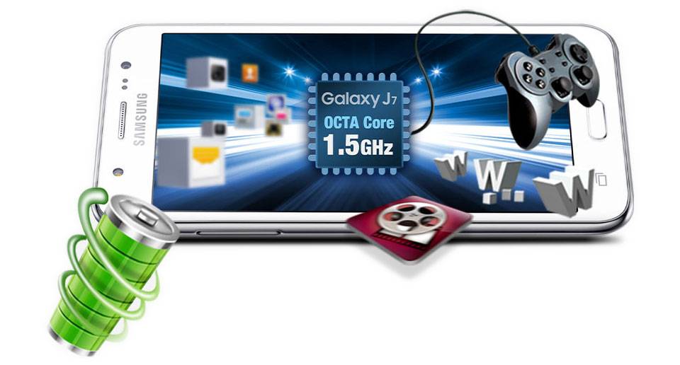 تراشهی اختصاصی اگزینوس 7580 سامسونگ برای این گوشی در نظر گرفته شده که پردازندهای 8 هستهای با معماری کورتکس A53 و قدرت پردازش 1.5 گیگاهرتز برای پردازشهای اصلی دارد؛ همچنین پردازندهی 650 مگاهرتزی Mali-T720MP2 برای پردازشهای گرافیکی و 1.5 گیگابایت رم هم روی این تراشه قرار دارند. این مجموعهی سختافزاری در آزمون AnTuTu نمرهی پذیرفتنی 38484 را به دست آورد. در آزمون گرافیکی هم از 60 فریم ورودی با رزولوشن fullHD، در بهترین حالت، فقط 22 فریم پردازش و نمایش داده شد. این تعداد فریم برای J7 که با محوریت بازی ساخته شده، آنچنان مطلوب نیست. برای این گوشی 16 گیگابایت حافظهی داخلی در نظر گرفته شده که از این 16 گیگابایت، فقط 11 گیگابایت در اختیار کاربر است. امکان استفاده از کارت حافظهی جانبی تا حجم 128 گیگابایت هم برای کاربران گوشی فراهم شده تا بابت این حافظهی کم، نگرانی وجود نداشته باشد.