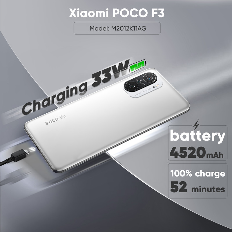 گوشی موبایل شیائومی POCO F3 دو سیم کارت یک باتری لیتیوم-پلیمر با ظرفیت 4520 میلیآمپرساعت دارد. این میزان ظرفیت باتری فوقالعاده است و میتواند این گوشی را به محصولی شگفتانگیز از لحاظ قدرت و ماندگاری شارژ باتری در بین محصولات میانرده بازار تبدیل کند. باتری در شرایط استفاده معمولی، میتواند ۲ الی ۳ روز گوشی را روشن نگه دارد. با این حال تماشای فیلم با صفحه نمایش کاملا روشن و بازی کردن، مخصوصا بازیهای سبک، مصرف باتری را بالا میبرد و اینجا است که مشاهده میکنید باتری زودتر تمام میشود. این باتری استفاده شده در F3 لیتیوم-پولیمری است که جدیدترین نوع باتری برای استفاده در گوشیها است. گفتنی است طبق ادعای شیائومی باتری این گوشی 52 زمان برای تکمیل شارژ نیاز دارد و این موضوع نشان از شارژر سریع 33 واتی اسن محصول است.