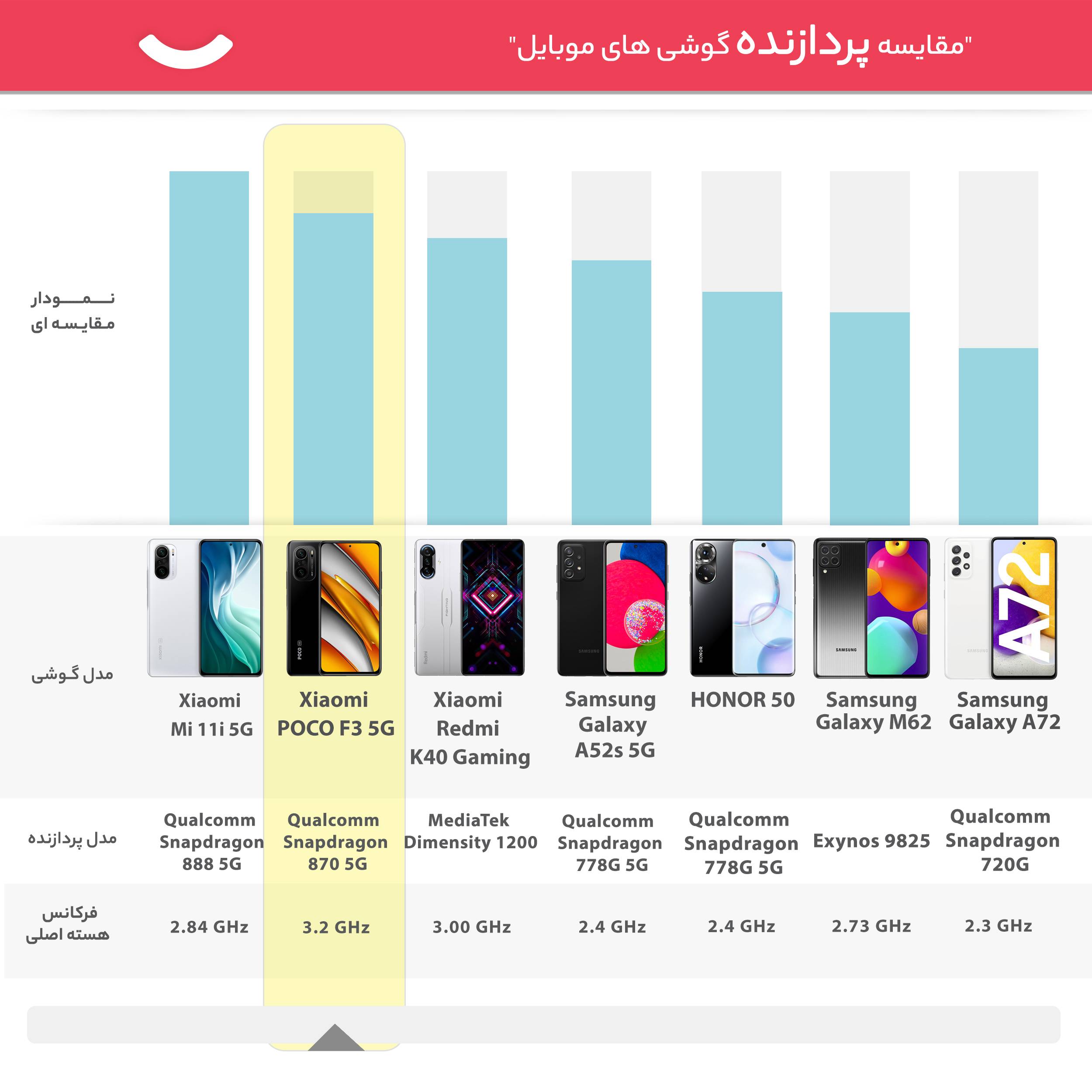 اگر بخواهیم بهصورت کاملا فنی و دقیق به مهمترین بخشهای داخلی سختافزاری گوشی که تراشه، پردازنده، پردازنده گرافیکی و حافظهها هستند به طور خلاصه نگاهی داشت، میتوان گفت که گوشی موبایل پوکو مدل POCO F3 M2012K11AG دو سیم کارت ظرفیت ۱۲۸ گیگابایت به تراشه Qualcomm SM8250-AC Snapdragon 870 5G (7 nm) Chipset مجهز شده است. تراشهای که برای استفاده روی گوشیهای میانرده رو به بالا ساخته و طراحیشده است. این تراشه ۳ پردازنده Kryo 585، Triple-Core Kryo 585 و Quad-Core Kryo 585 با فرکانسهای 3.2، 2.42، 1.80 گیگاهرتز را در خود قرار داده که بتواند سرعت و قدرت عملیاتی بالایی را برای گوشی را فراهم کند. روی این تراشه از پردازنده گرافیکی Adreno 650 GPU هم استفادهشده است که میتوان با آن کارها و بازیهای گرافیکی معمولی یا نیمهسنگین و در برخی اوقات سنگین را هم انجام داد. باید به این اشاره داشته باشیم که پردازنده این گوشی ۶۴ بیتی بوده و دارای سرعت بسیار بالاتری نسبت به پردازندههای ۳۲ بیتی است. ۶ گیگابایت حافظه رم هم برای این تلفن همراه هوشمند در نظر گرفتهشده تا گوشی در بهترین حالت ممکن بتواند چند کار را با هم انجام دهد ولی با کمی کاهش سرعت روبرو میشود. این مقدار حافظه رم نقطه ضعفی برای این گوشی محبوب نیست. سازندگان POCO F3 برای این مدل از حافظه داخلی ۱۲۸ گیگابایت استفاده کردهاند. در آزمایشات ما نشانداده شده است که این گوشی با این مقدار حافظه و RAM میتواند به راحتی پاسخ گوی نیازهای شما باشد. همچنین شیائومی با بکارگیری فناوری LiquidCool یا خنککننده مایع، موجب خنک شدن گوشی در هنگام اجرای برنامههای سنگین شده است که این امر باعث بهبود عملکرد کلی دستگاه میشود.