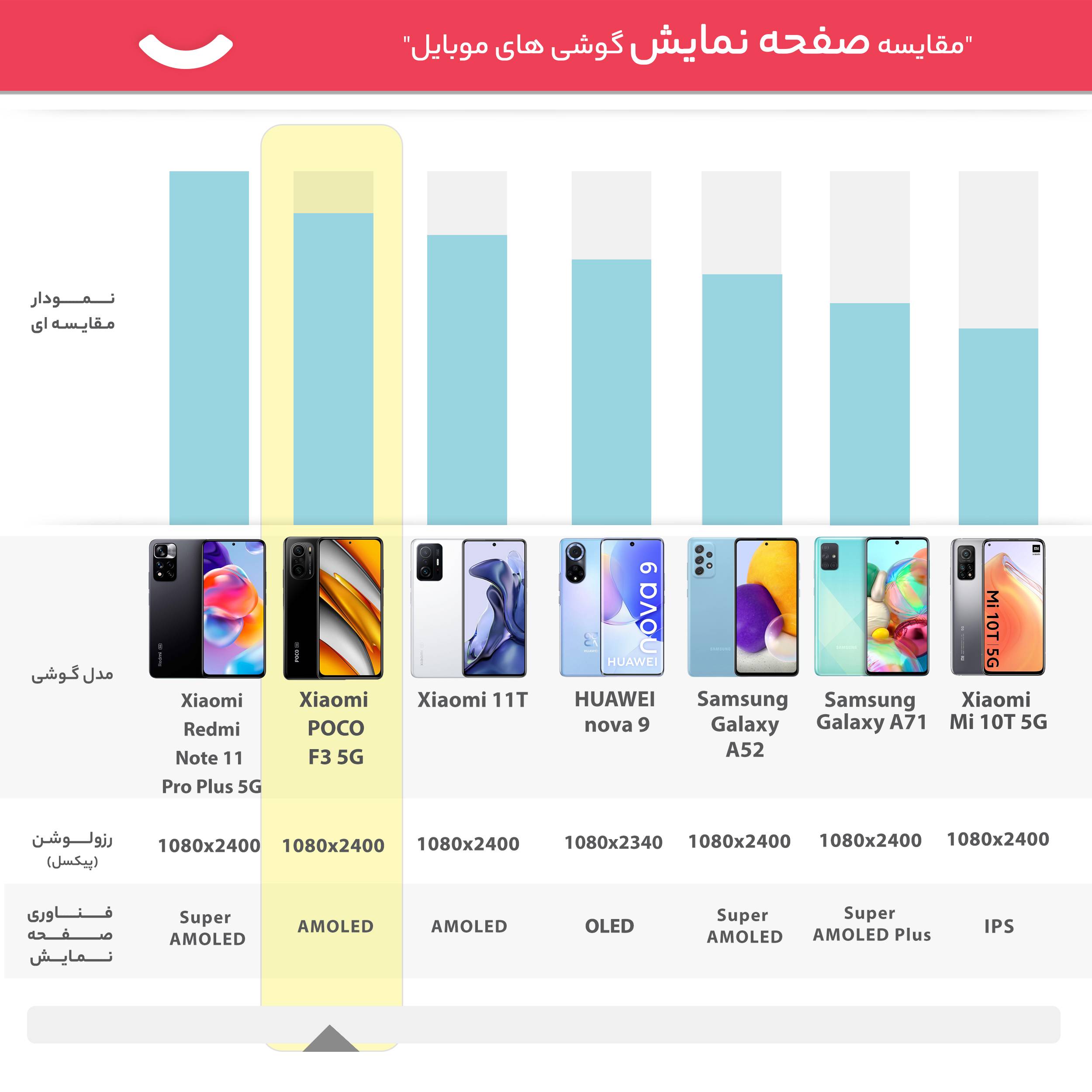 | سایر قابلیتها | نرخ تازهسازی 120 هرتز بیشینه روشنایی 1300 نیت HDR10+ رابط کاربری MIUI 12 for POCO |