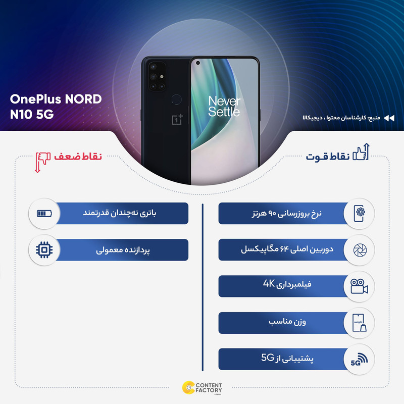 گوشی موبایل وان پلاس مدل NORD N10 5G BE2029 یکی از محصولات میانرده است که با حسگر انگشت در پشت گوشی و دوربین چهارگانه میتواند گزینهای مقرون به صرفه باشد. وانپلاس سال 2020 را با رقابتی کردن گوشیهای خود آغاز کرد. این سری از تولیدات وانپلاس به داشتن صفحهنمایش باکیفیت IPS LCD با 90Hz و دوربینهایی با امکانات بالا شهرت دارند. گوشی موبایل وان پلاس مدل NORD N10 5G از نظر ظاهری بسیار جذاب به نظر میرسد و بخشی از این جذابیت به نمایشگر آن مربوط است. وانپلاس تلاش کرده تا حاشیه صفحه نمایش را در این گوشی تا حد امکان کم کند. این گوشی قاب پشتی از جنس پلاستیک دارد و قاب جلویی آن را شیشه پوشانده که در مجموع جلوهی زیبایی به ظاهر آن بخشیده است. صفحهنمایش استفادهشده در این گوشی با ابعاد 6.49 اینچ و رزولوشن FullHD Plus و همچنین استفاده از فناوری IPS تصاویر شفافی را به نمایش میگذارد. این صفحهنمایش در هر اینچ 406 پیکسل را نشان میدهد که این موضوع به معنای جزئیات و وضوح تصویر عالی آن است. همچنین برای روکش این نمایشگر از لایهی محافظ Corning Gorilla Glass 3 استفاده شده است که در برابر خطوخش و ضربه مقاوم است. تراشهی این محصول Qualcomm SM6350 Snapdragon 690 5G (8 nm) Chipset از تراشههای 8 نانومتری کوالکام است که به همراه 6 گیگابایت رم عرضه میشود. این تراشه برای بازکردن چندین برنامه به صورت همزمان و تماشای ویدئو کاملاً مناسب است. تراشهی گرافیکی Adreno 619L هم برای پخش ویدئو و بازی در این محصول درنظر گرفته شده است. این گوشی با ظرفیت داخلی 128 گیگابایتی عرضه شده است. دوربین اصلی NORD N10 5G یک سنسور 64 مگاپیکسلی دارد و از فلش LED برخوردار است. سنسور 8 مگاپیکسلی دیگر از نوع فوقعریض (Ultrawide) و سنسور 2 مگاپیکسلی عمق و لنز ماکرو هم در کنار این دوربین اصلی مجموعه دوربینهای قاب پشتی NORD N10 5G را تشکیل دادهاند. دوربین سلفی 16 مگاپیکسلی هم در قاب جلویی این گوشی به کار گرفته شده است. باتری 4300 میلیآمپرساعتی، پشتیبانی از فناوری شارژ سریع 30 واتی، درگاه USB Type-C 2.0 و حسگر اثرانگشت اپتیکال در پشت گوشی هم از دیگر ویژگیهای این گوشی به شمار میرود.
