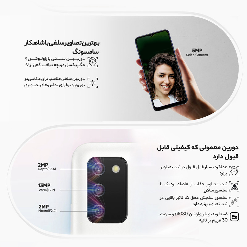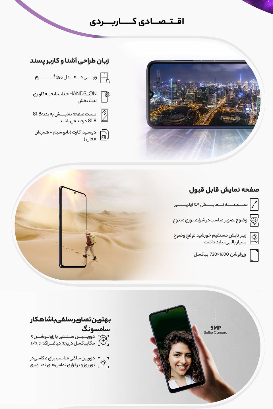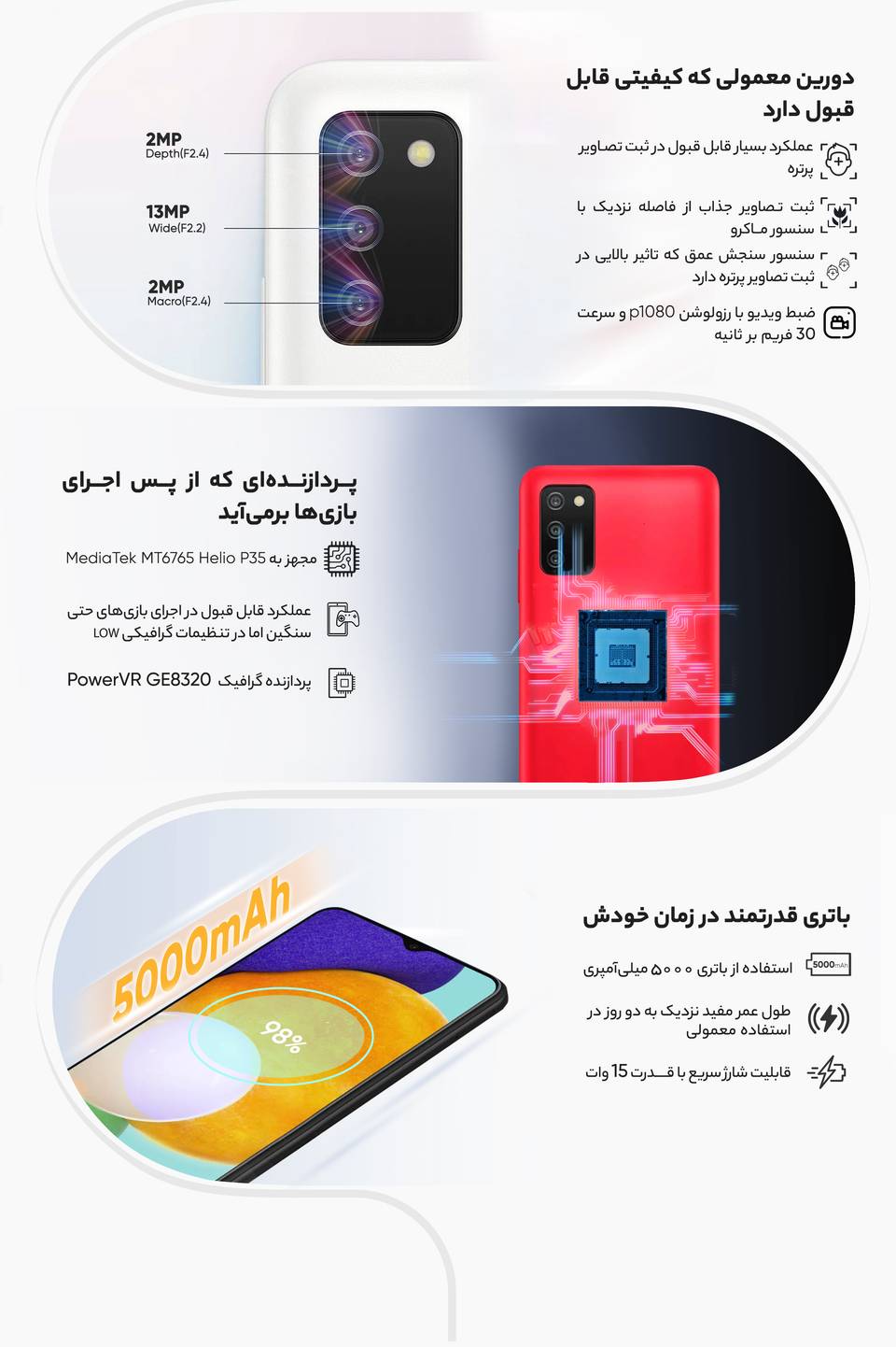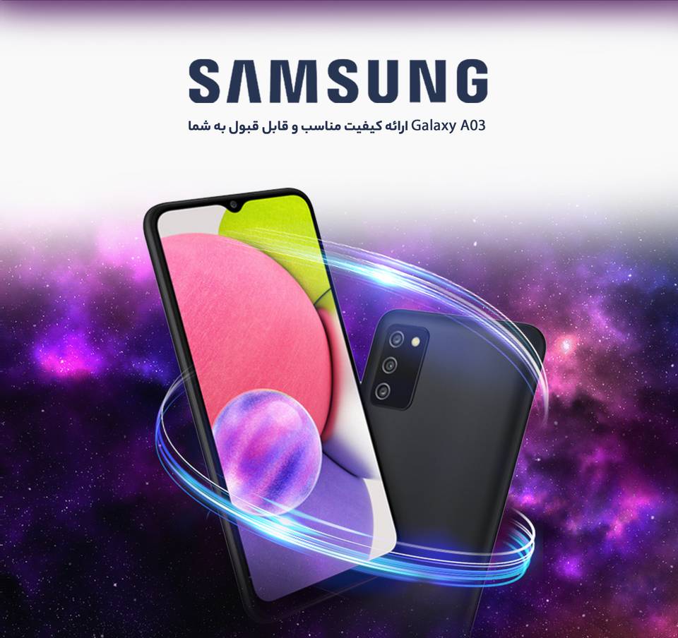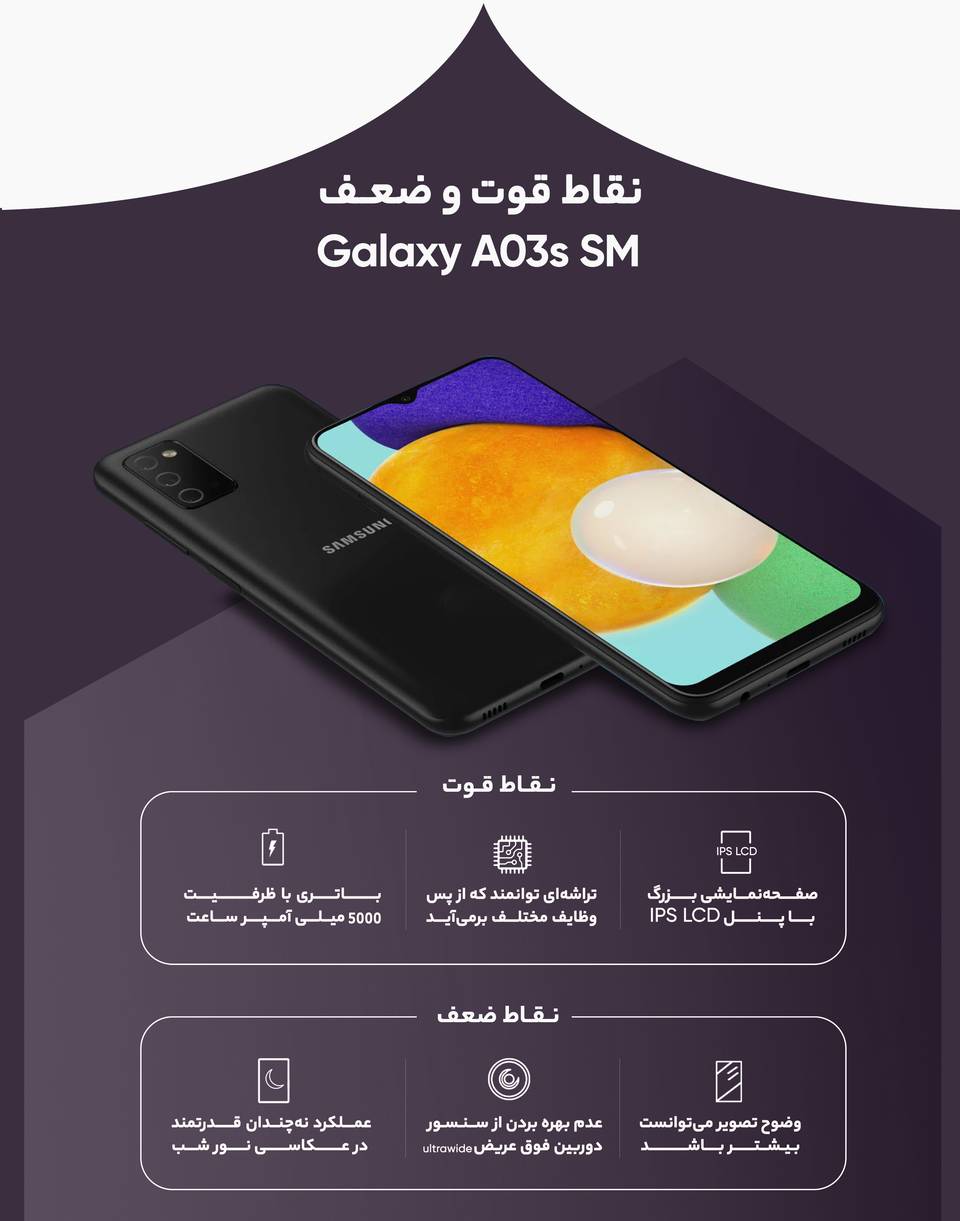 گوشی موبایل سامسونگ مدل Galaxy A03s SM-A037F/DS که 64 گیگابایت و رم 4 گیگابایت ظرفیت دارد از محصولات مقرونبهصرفه و پایینرده شرکت سامسونگ است که به تازگی معرفی و روانه بازار شد. با تمام این تفاسیر این گوشی دارای یک پردازنده 8 هستهای است. این محصول دارای صفحه نمایش 6.5 اینچ با رزولوشن 720x1600 پیکسل است که این صفحهنمایش در هر اینچ 270 پیکسل را نشان میدهد. تراشه این محصول از نوع MediaTek MT6765 Helio P35 (12nm) Chipset است که برای کاربرد روزمره و متوسط رو به پایین از نظر پردازشی مناسب خواهد بود. سامسونگ مدل Galaxy A03s SM-A037F/DS با حافظه 64 گیگابایتی و رم 4 گیگابایتی برای افرادی که از موبایل خود فقط برای کارهای روزمره و نه انجام بازیهای سنگین و یا کار با نرمافزارهای حرفهای استفاده میکنند، مناسب و به اندازه نیاز است. همچنین در نظر داشته باشید که با استفاده از یک کارت حافظهی جانبی قادر خواهید بود این میزان از حافظه را افزایش دهید. قاب پشتی این گوشی موبایل 3 ماژول دوربین دارد. منبع انرژی گوشی Galaxy A03 باتری لیتیوم-پولیمری با ظرفیت 5000 میلیآمپرساعت است که برای این گوشی با کارایی و ویژگیهایی که دارد کافی و مناسب خواهد بود. این موبایل برای کسانی که استفادهی روزمرهای از گوشی موبایل دارند و قصد انجام کارهای حرفهای و تخصصی نظیر ادیت فیلم، بازیهای سنگین و دیگر کارها را با گوشی خود ندارند، گزینهی اقتصادی و به صرفهای است.