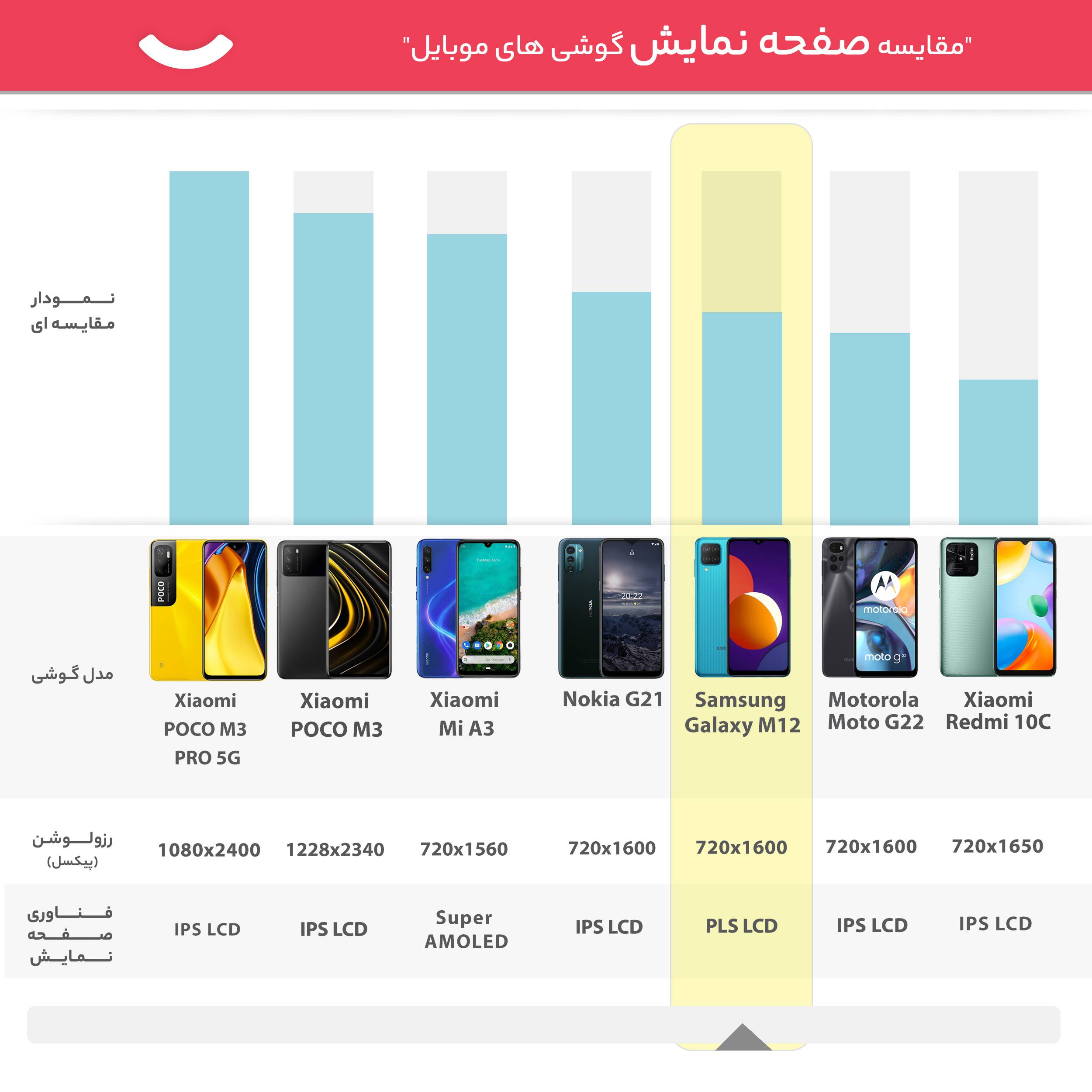 اکثر گوشیهای هوشمند سامسونگ در بخش صفحهنمایش تا به امروز عملکرد بسیار خوب و قابل قبولی داشتهاند. سامسونگ گلکسی M12 هم به صفحهنمایش 6.5 اینچ با رزولوشن 720×1600 پیکسل از نوع PLS IPS مجهز شده است. صفحهنمایش که در هر اینچ توانایی نمایش 270 پیکسل و ارائه نرخ بروزرسانی 90 هرتز را دارد. اکثر گوشیهای هوشمند میانرده به صفحاتنمایش با نرخ بروزرسانی 60 هرتز مجهز شدهاند، اما این گوشی با بهره بردن از صفحهنمایش 90 هرتز، بدون شک کیفیت بهتری به نسبت صفحاتنمایش با نرخ بروزرسانی 60 هرتز ارائه خواهند کرد و این تفاوت کیفیت در گیمپلی و تماشای ویدیو با کیفیت بالا، بهتر دیده میشود. اما شاید بهتر بود که سامسونگ میزان رزولوشن و تراکم پیکسل بهتری را برای این صفحهنمایش در نظر میگرفت. البته به نسبت یک گوشی هوشمند میانرده در مجموع باید گفت که سامسونگ گلکسی M12 به صفحهنمایش مناسب و کاملا قابل قبولی مجهز شده است. سامسونگ در بخش طراحی هم سعی داشته تا کمترین میزان حاشیه را در نظر بگیرد و نزدیک به 82 درصد از نمای روبهرویی را صفحهنمایش به خودش اختصاص داده است.