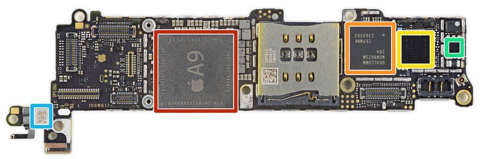 این تراشهی نسل سومی از سری تراشههای ساخت اپل با اسم کد «سایکلون 3» (Cyclone 3) است که A9 نام دارد. روی این تراشه، پردازندهی دوهستهای با قدرت پردازش 1.8 گیگاهرتز با معماری ARMv8 قرار گرفته است. همچنین این تراشه بر پایهی لیتوگرافی 14 نانومتری ساخته شده و فوقالعاده کممصرف است. در کنار این پردازندهی دوهستهای، حضور پردازندهی گرافیکی PowerVR GT7600 با اسم کد «روگ» (Rogue) هم پررنگ است. در آزمونهای مختلف مشخص شده که قدرت پردازشی بالاتری در مقایسه با آدرنو 430 کوالکام و تگرا K1 انویدیا دارد. البته پردازندهی حرکتی اختصاصی اپل با نام M9 هم روی این تراشه قرار دارد. وظیفهی پردازندهی کمکی M9، پردازش حرکتهای آیفون SE در کنار رمزگذاری و رمزگشایی ویدیوهای 4K است. جدا از پیشرفتهای تراشهی اصلی، تراشهی مودم هم که ساخت شرکت کوالکام است، حالا از شبکههای 4G نوع چهارم با امکان استفاده از باندهای بیشتر پشتیبانی میکند.