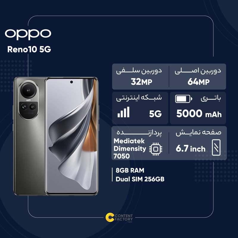 گوشی موبایل اوپو مدل Reno10 5G دو سیم کارت ظرفیت 256 گیگابایت و رم 8 گیگابایت
