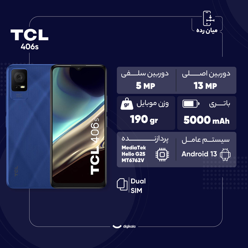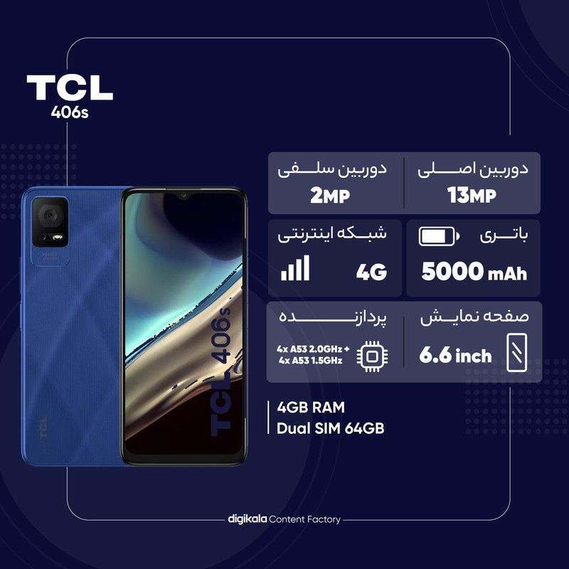 گوشی موبایل تی سی ال مدل 406s دو سیم کارت با ظرفیت 64 گیگابایت و رم 4 گیگابایت، یک گوشی میان رده با عملکرد معمولی است که برای استفاده روزمره و کارهای عمومی مناسب است. این گوشی دارای ویژگیهای اساسی است که میتواند نیازهای عمومی کاربران را برآورده کند. در ادامه با ما همراه باشید تا این ویژگیها و مشخصات را بررسی کنیم: